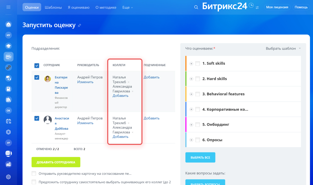 Коллеги. Для каждого сотрудника автоматически подставляются коллеги, которые будут его оценивать. Можно вручную выбрать других коллег.