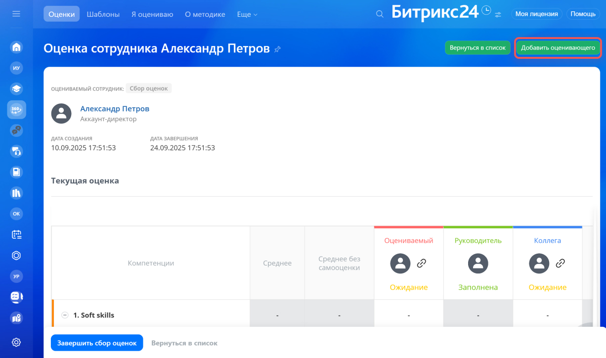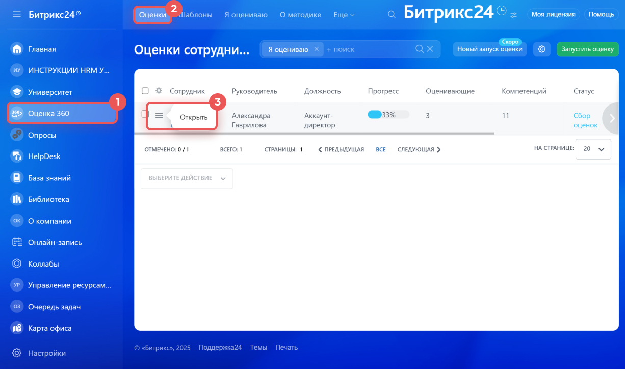 Перейдите в раздел Оценка 360 > Оценки и откройте нужную карточку.