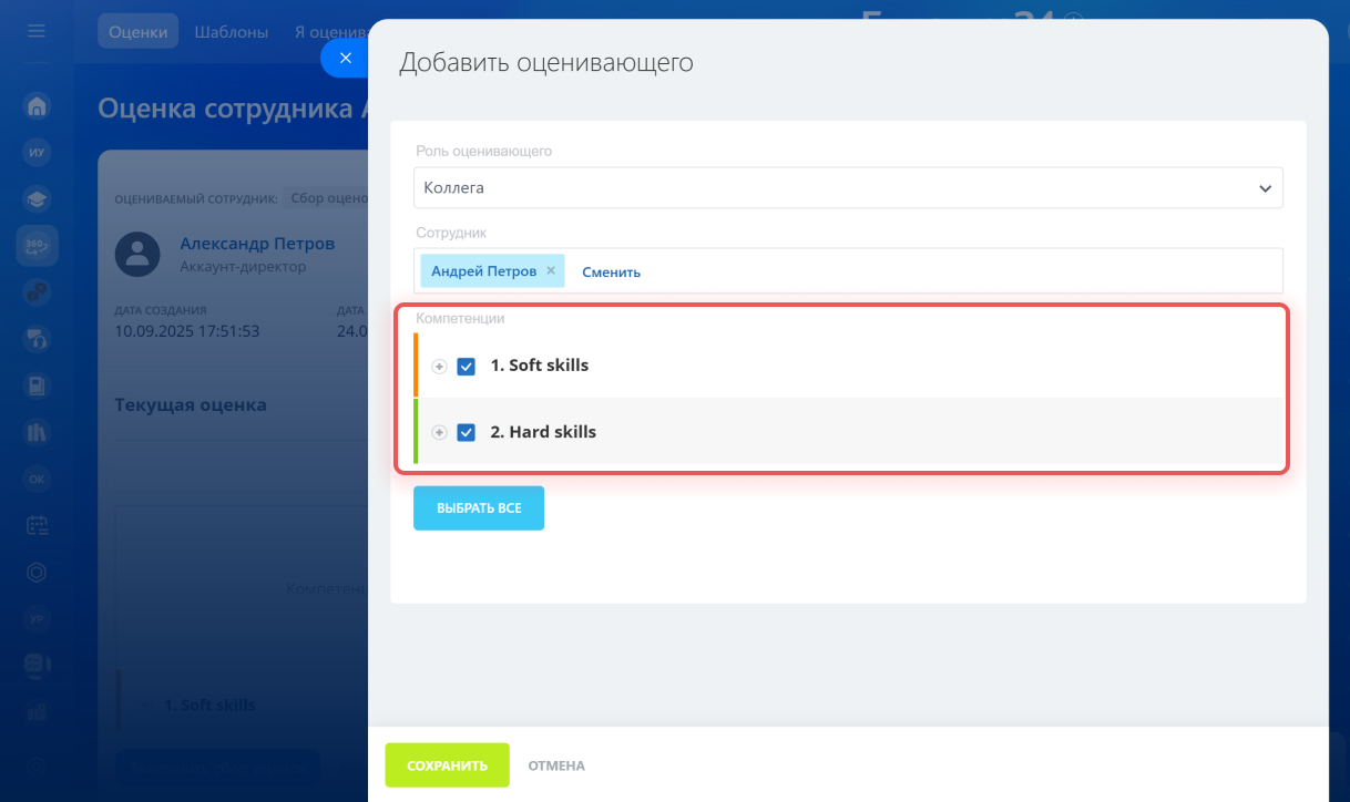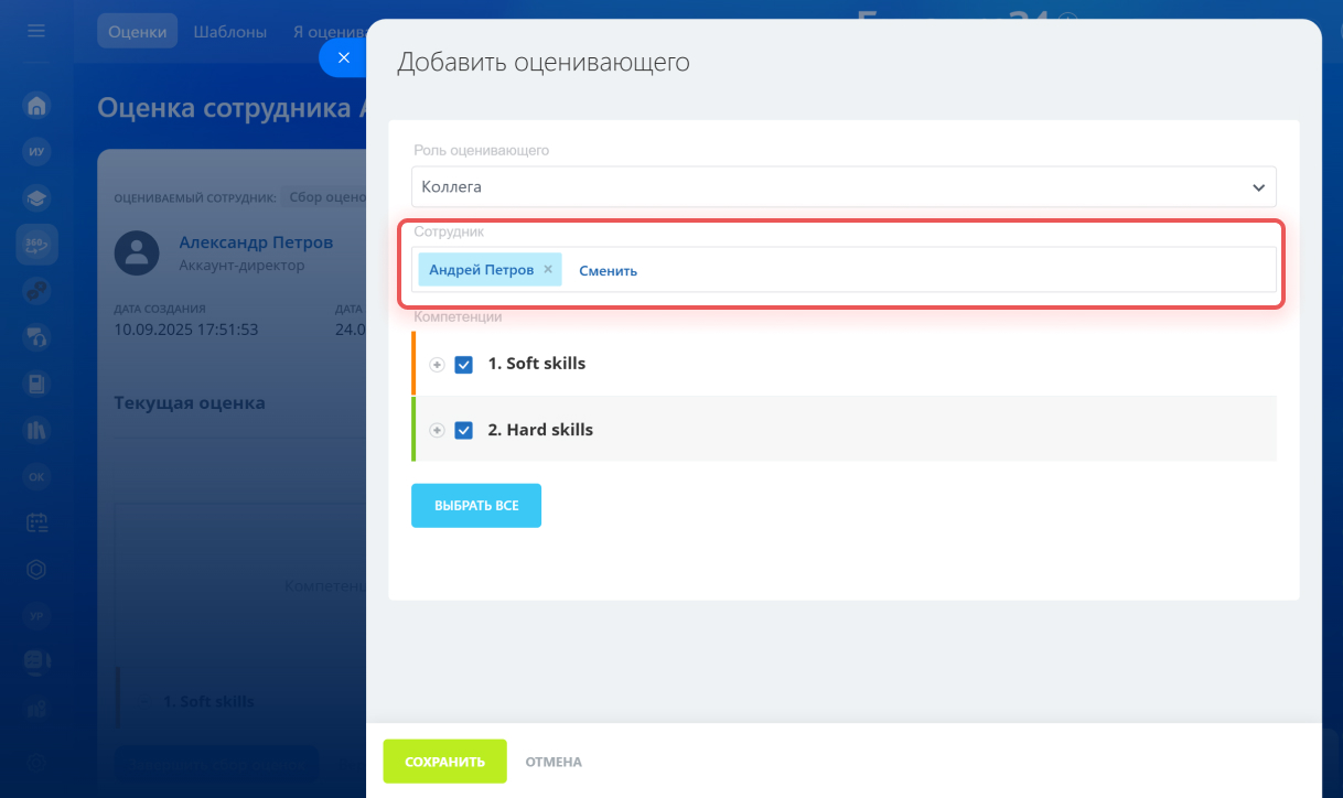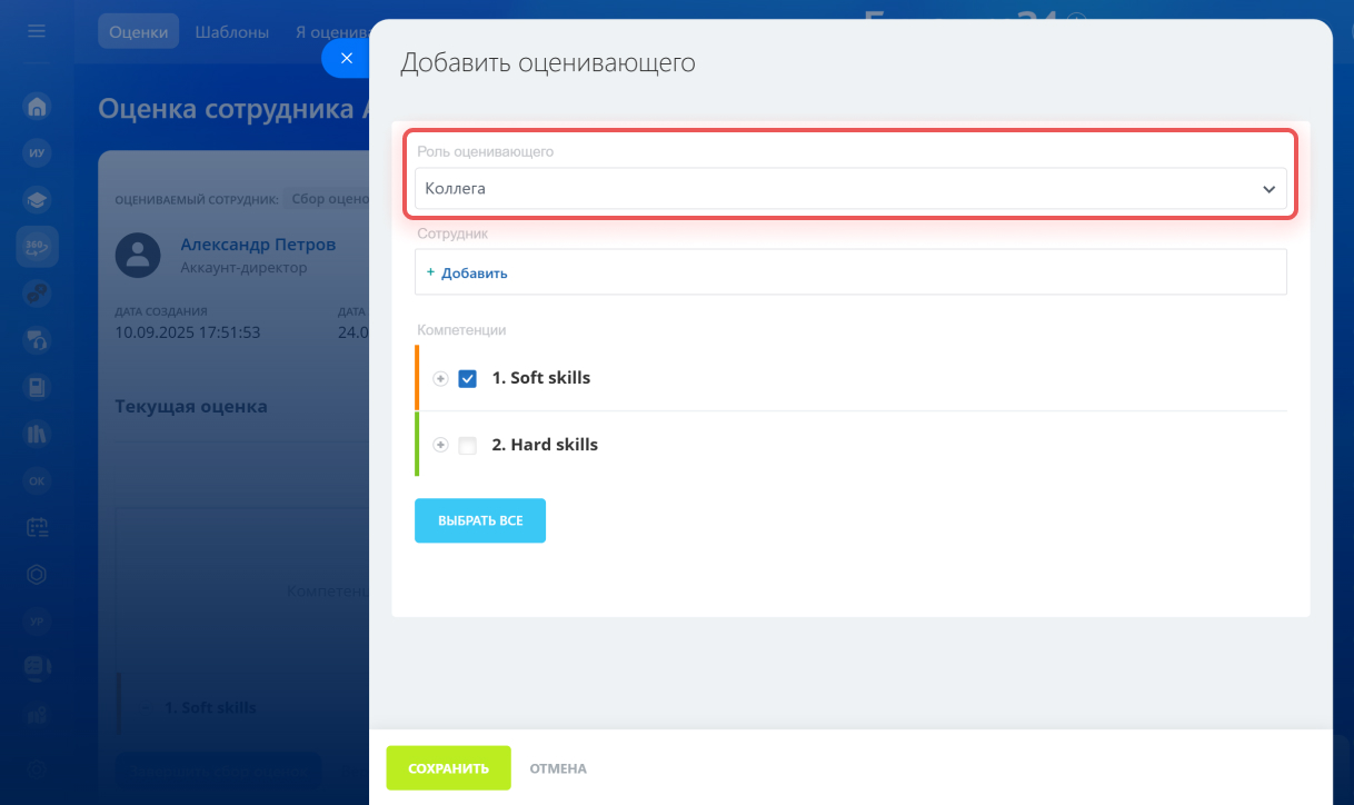 Роль оценивающего. Выберите, кого надо добавить к оценке: коллегу или подчиненного.