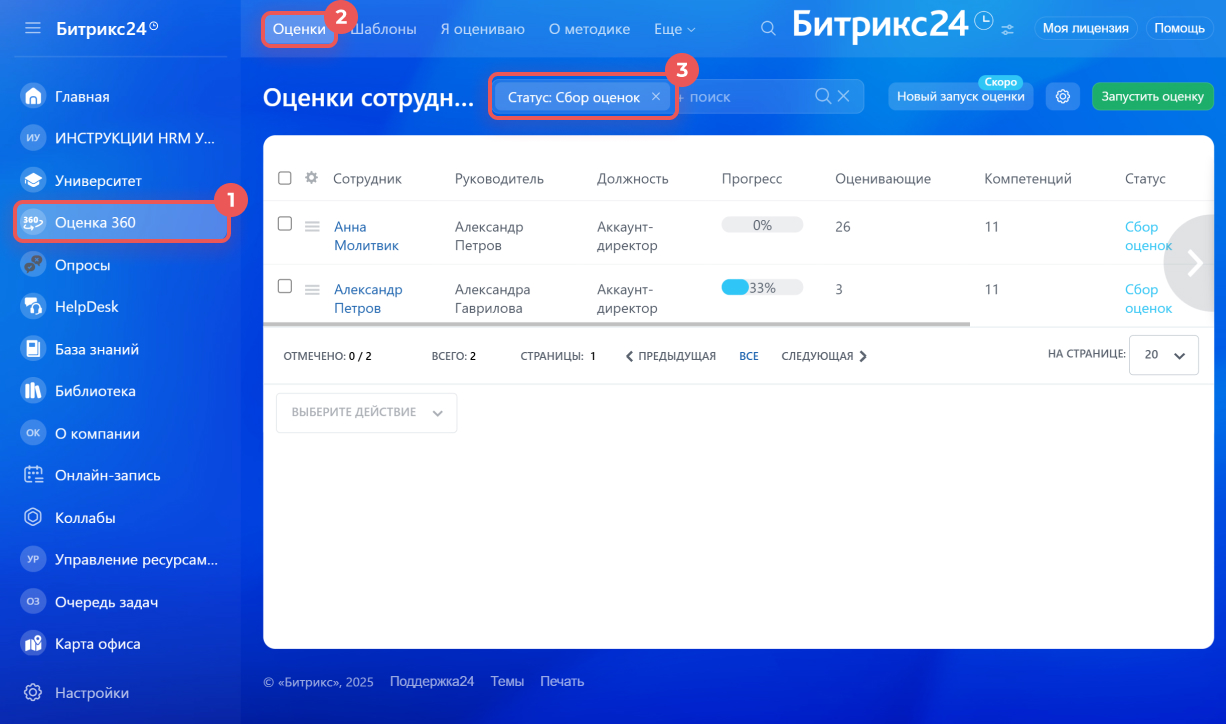 Перейдите в раздел Оценка 360 > Оценки и отфильтруйте карточки по статусу Сбор оценок.