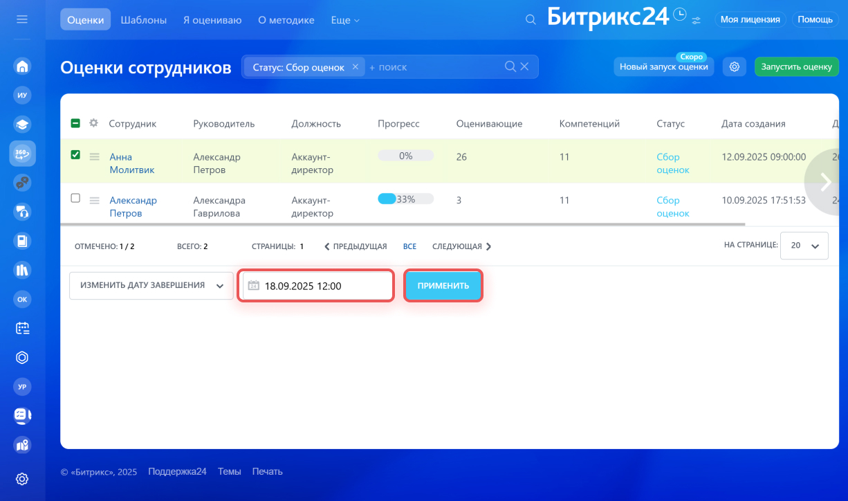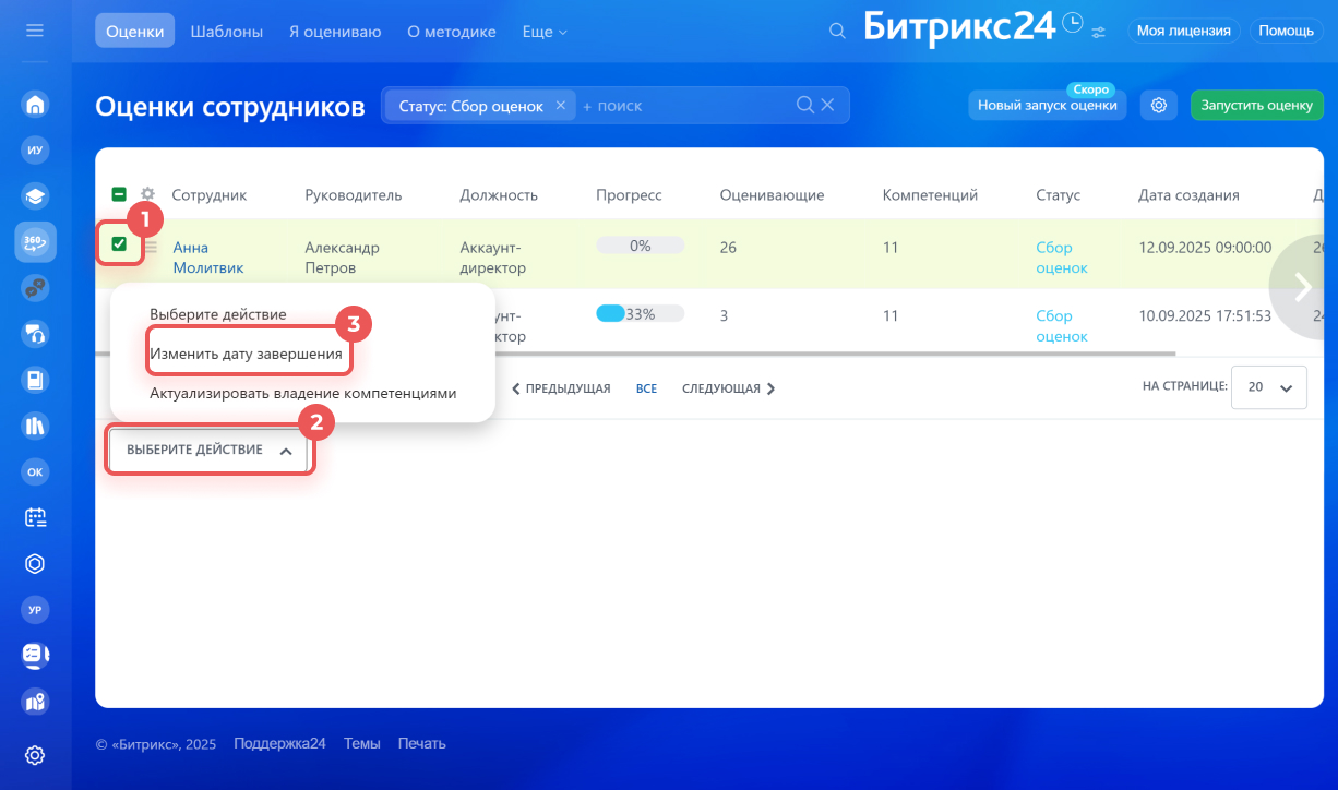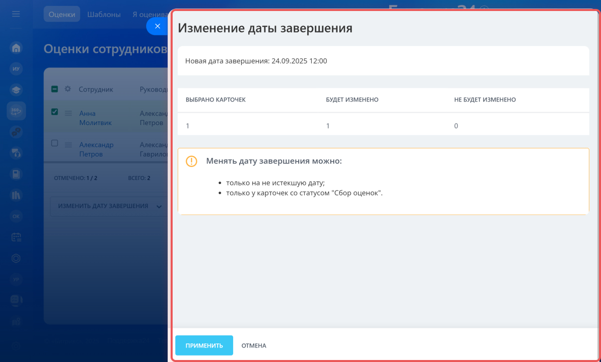 HR-специалист может изменить дату завершения оценки. Например, если один из ключевых участников процесса не успевает пройти оценку.