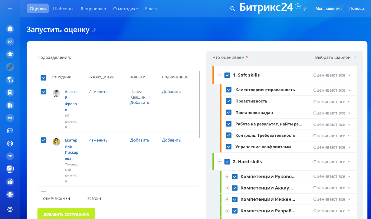 В Битрикс24 можно запустить оценку конкретного сотрудника или сразу всего отдела. Оценку всего отдела удобно запускать, если у всех сотрудников надо оценить одинаковый набор компетенций. В карточку оценки автоматически добавятся коллеги, подчиненные и руководитель. К оценке конкретного сотрудника можно привлечь клиентов из CRM.