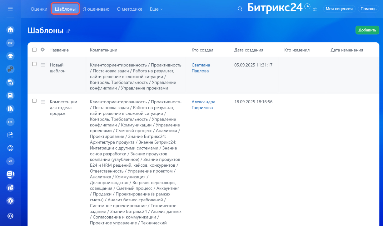 Если вы часто оцениваете у сотрудников одинаковый набор компетенций, можно создать шаблон. Это упростит запуск процесса оценки, так как все компетенции автоматически добавятся в карточку оценки. Например, можно создать шаблоны компетенций для разных отделов или ролей.