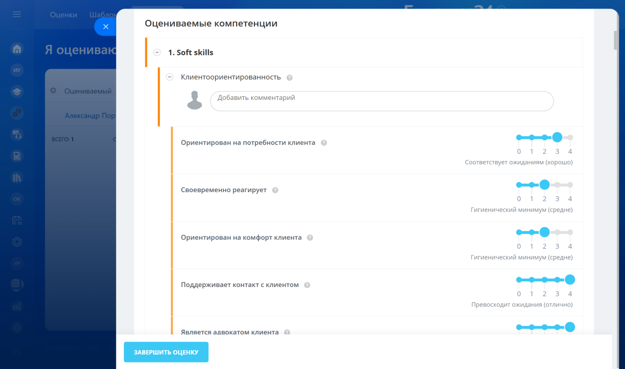 Компетенции сотрудников можно оценивать по баллам и индикаторам. Например, компетенцию Клиентоориентированность можно оценить от 0 до 10 баллов. Чем выше балл, тем лучше сотрудник владеет компетенцией.
