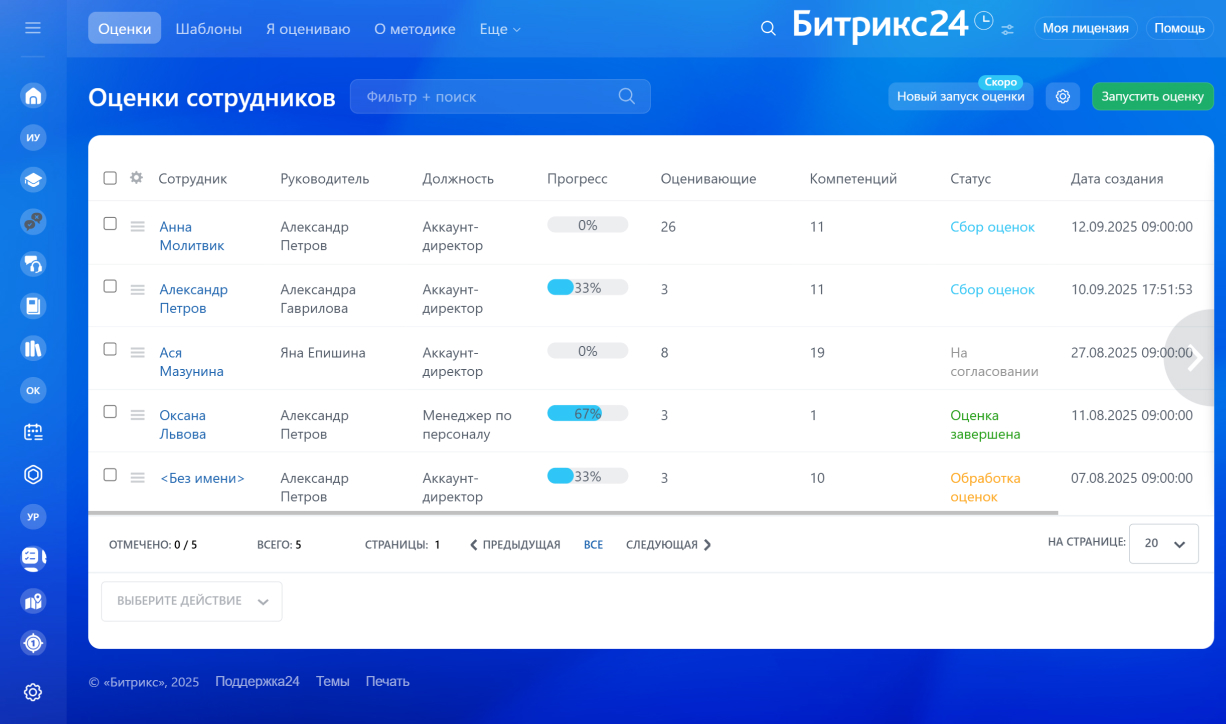 HR-менеджер и руководитель могут контролировать процесс оценки на странице Оценка 360 > Оценки.