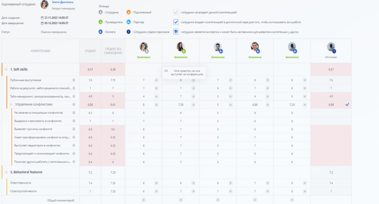По итогам оценки в Битрикс24 автоматически формируется сводная таблица с оценками и комментариями всех участников. По каждой компетенции рассчитывается средняя и итоговая оценка. На основании этой таблицы HR-менеджер может проанализировать результаты и подготовить резюме.
