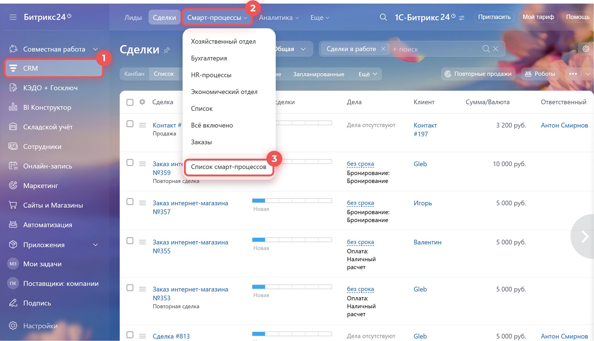 Перейдите в раздел CRM > Ещё > Смарт-процессы > Список смарт-процессов.