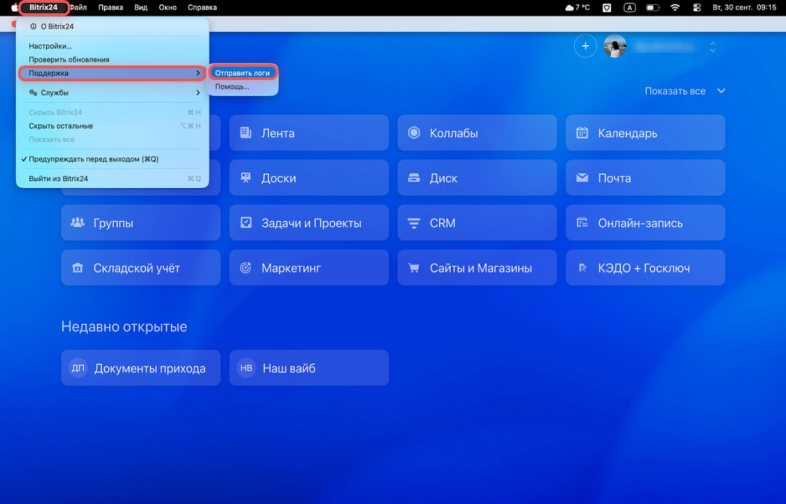 macOS и Linux. В меню приложения Битрикс24 нажать Поддержка > Отправить логи.