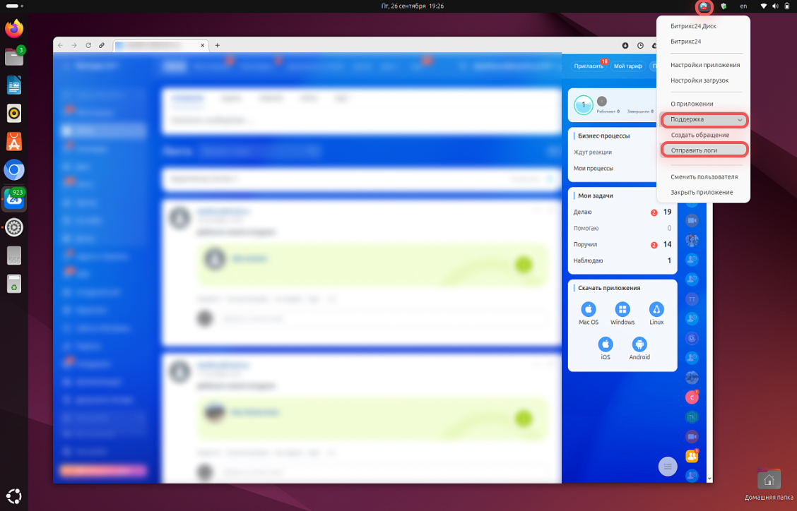 Linux. Откройте меню приложения Битрикс24, нажмите Поддержка > Отправить логи.