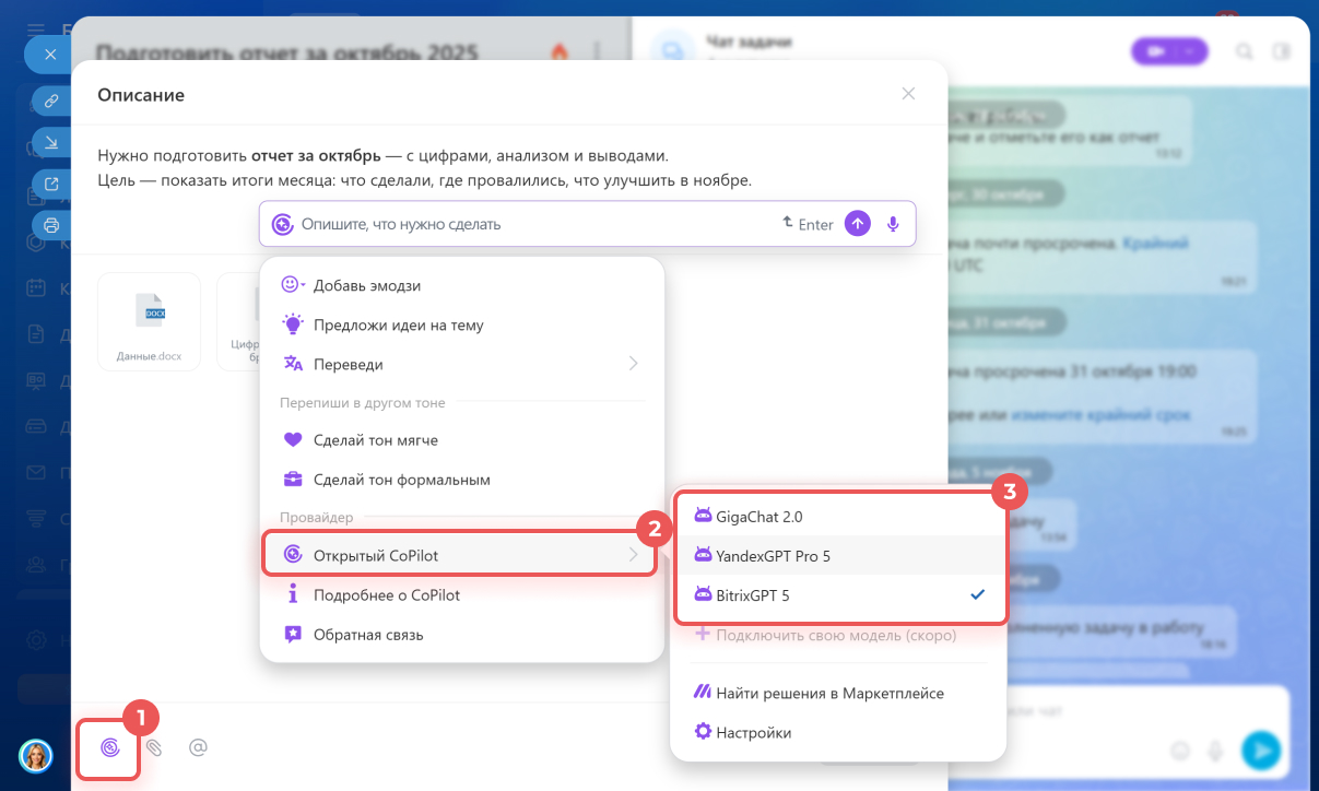 - Модель BitrixGPT используется по умолчанию в CRM, чатах, ленте, задачах и других инструментах.
