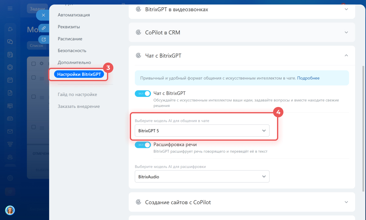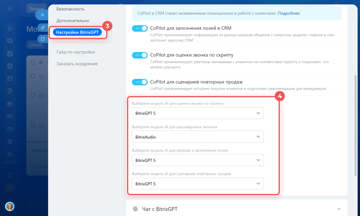 Перейдите в Настройки > Настройки BitrixGPT > BitrixGPT в CRM и выберите нужные модели.