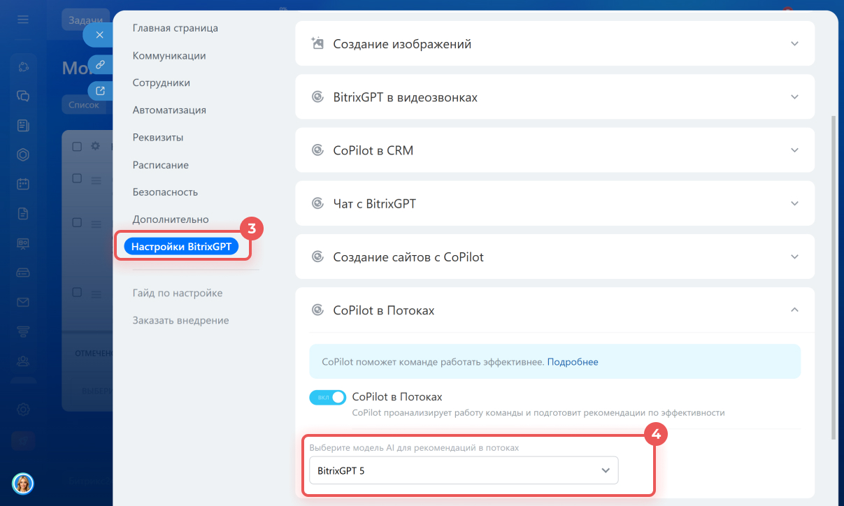 Потоки. Перейдите в Настройки Битрикс24 > Настройки BitrixGPT > BitrixGPT в Потоках и выберите нужную модель.