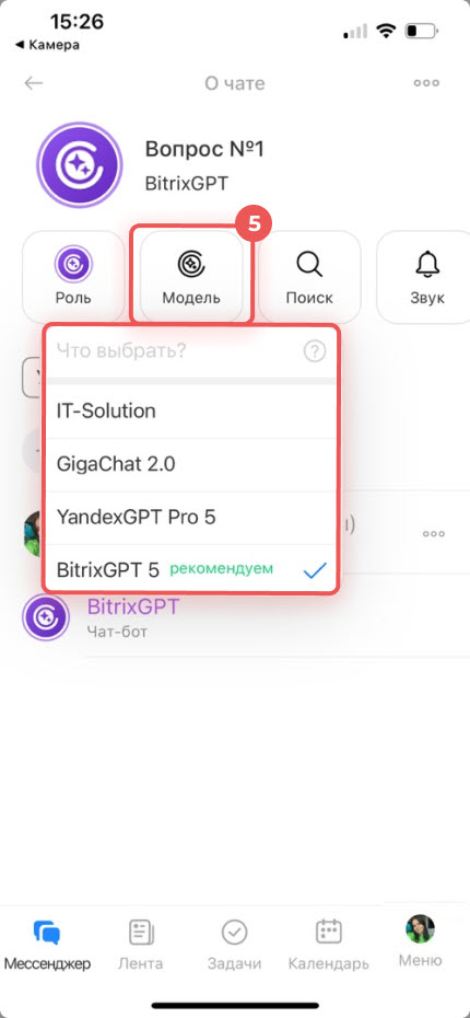 - Изменить модель в чате с BitrixGPT могут администратор Битрикс24 — для всех, а пользователи — только для себя.