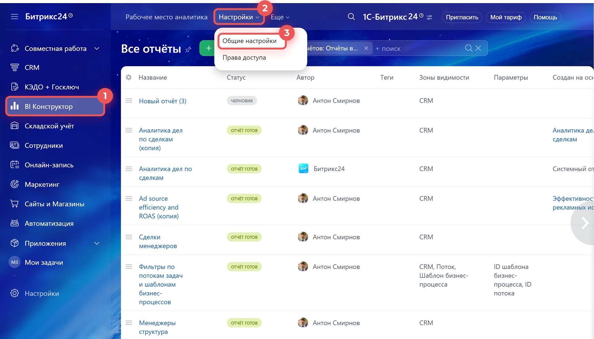 - Настроить конструктор можно в разделе CRM > BI Конструктор > Мои отчеты > Настройки (⚙️).