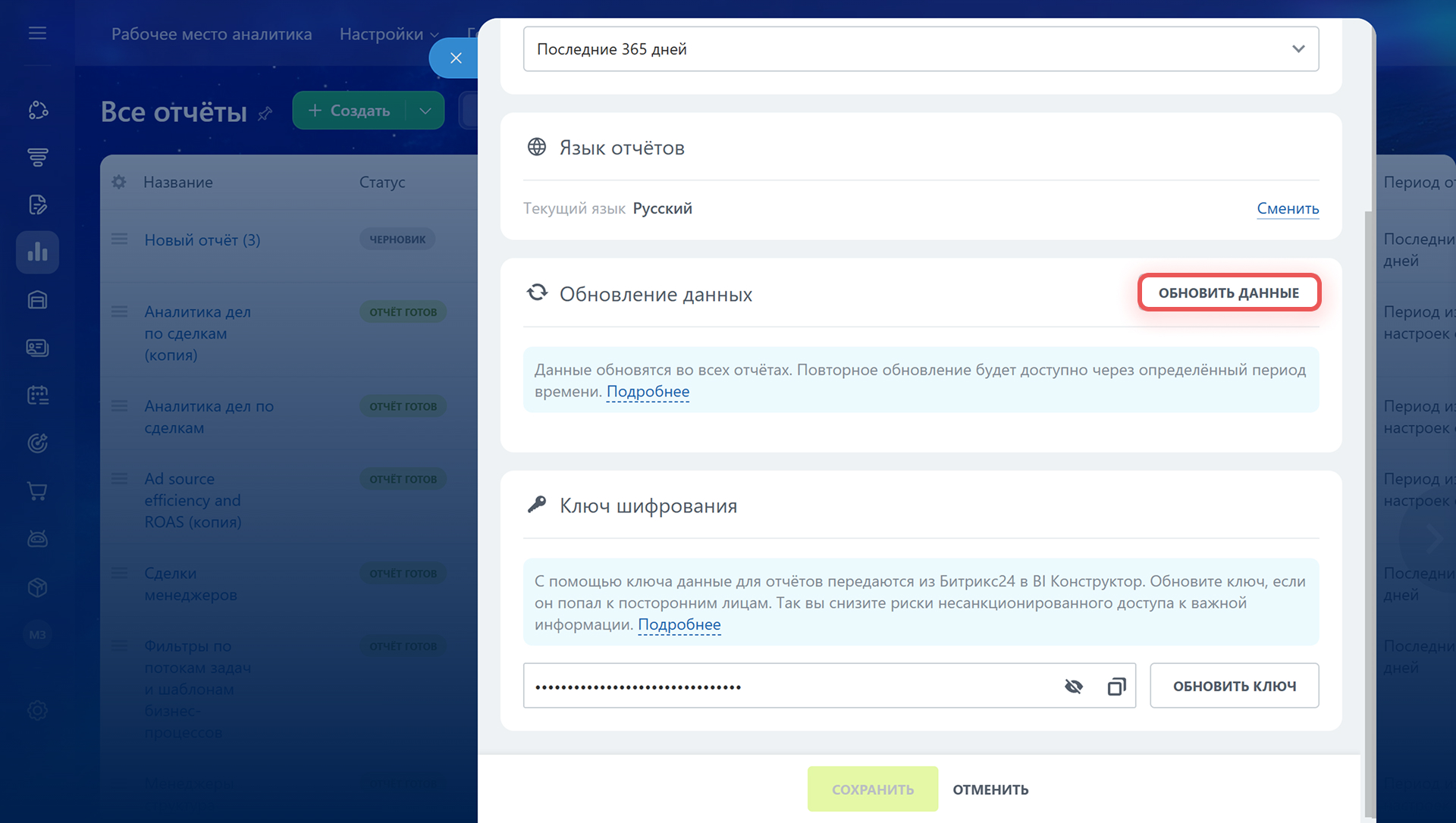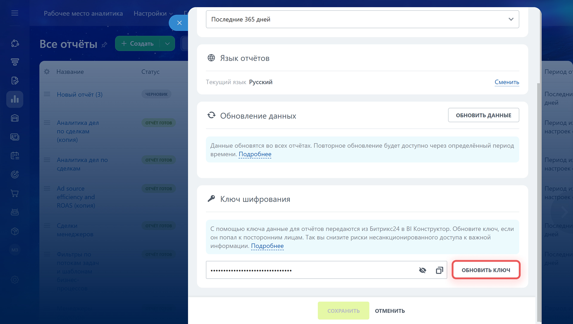 Ключ шифрования. Ключ — это уникальный идентификатор, который связывает данные из Битрикс24 с BI Конструктором. Обновите ключ, если он стал известен посторонним.