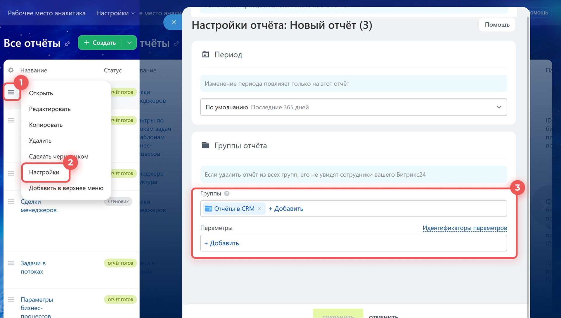 Группы отчета. При создании отчета выберите группу, к которой он будет относиться. Отчет всегда создаётся внутри группы. Доступ к нему определяется правами роли на эту группу. Группа — это подборка отчетов по одной теме. В Битрикс24 есть готовые группы: для отчетов из Маркетплейса и системных отчетов. Каждая группа связана с определенным разделом или инструментом.