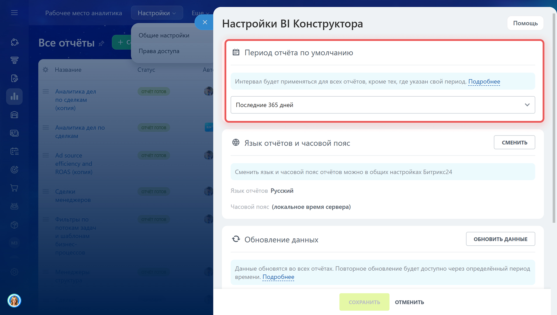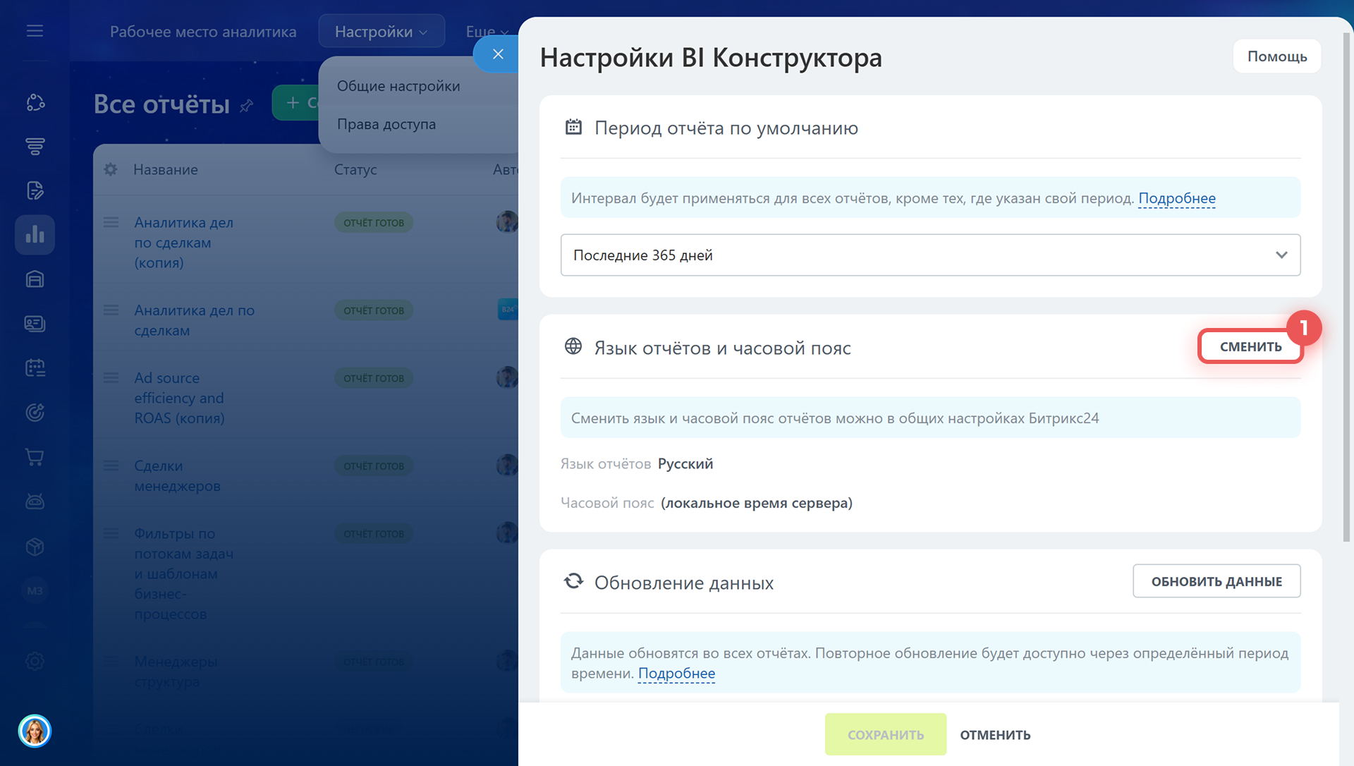 - Настроить конструктор можно в разделе CRM > BI Конструктор > Мои отчеты > Настройки (⚙️).