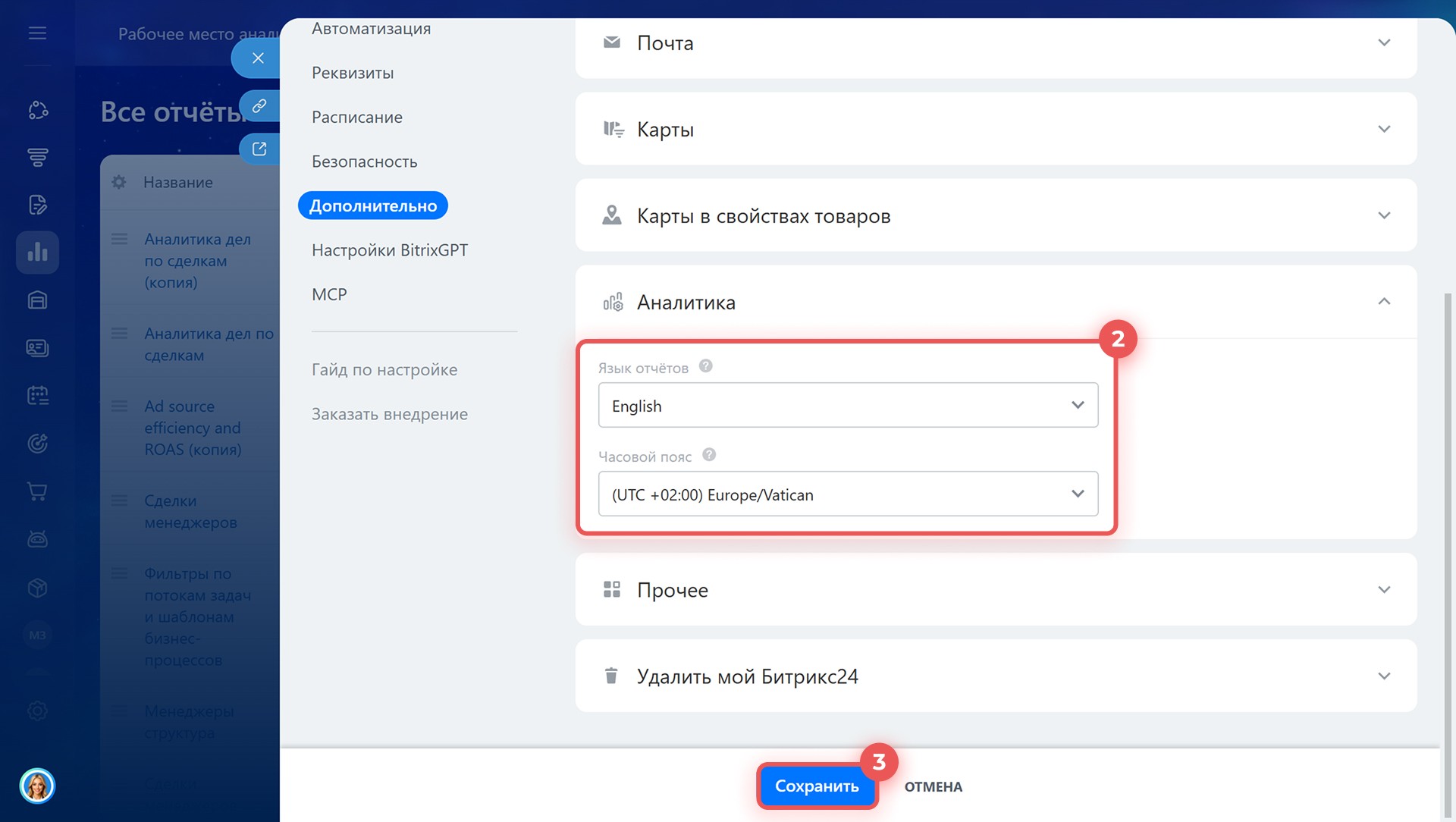 - В настройках можно изменить язык отчетов и часовой пояс для аналитики. Язык влияет на подписи и показатели в отчетах, а часовой пояс помогает показывать данные в едином времени.