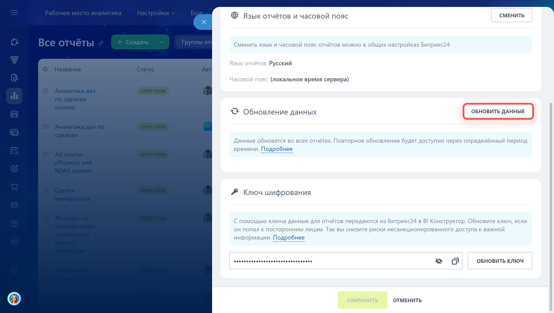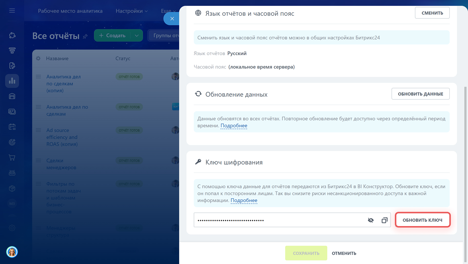 Ключ шифрования. Ключ — это уникальный идентификатор, который связывает данные из Битрикс24 с BI Конструктором. Обновите ключ, если он стал известен посторонним.