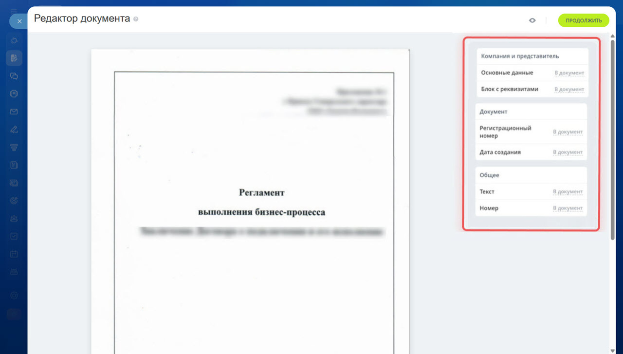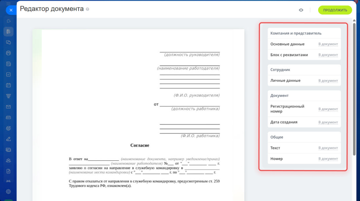- Чтобы дополнить документ, используйте блоки редактора справа: Компания и представитель, Сотрудник, Документ, Общее.