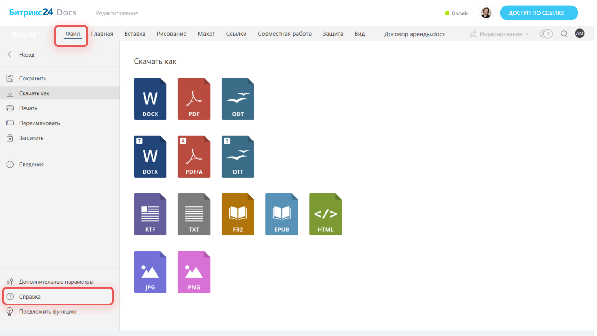 Если хотите узнать о возможностях редактора Битрикс24, нажмите Файл > Справка.