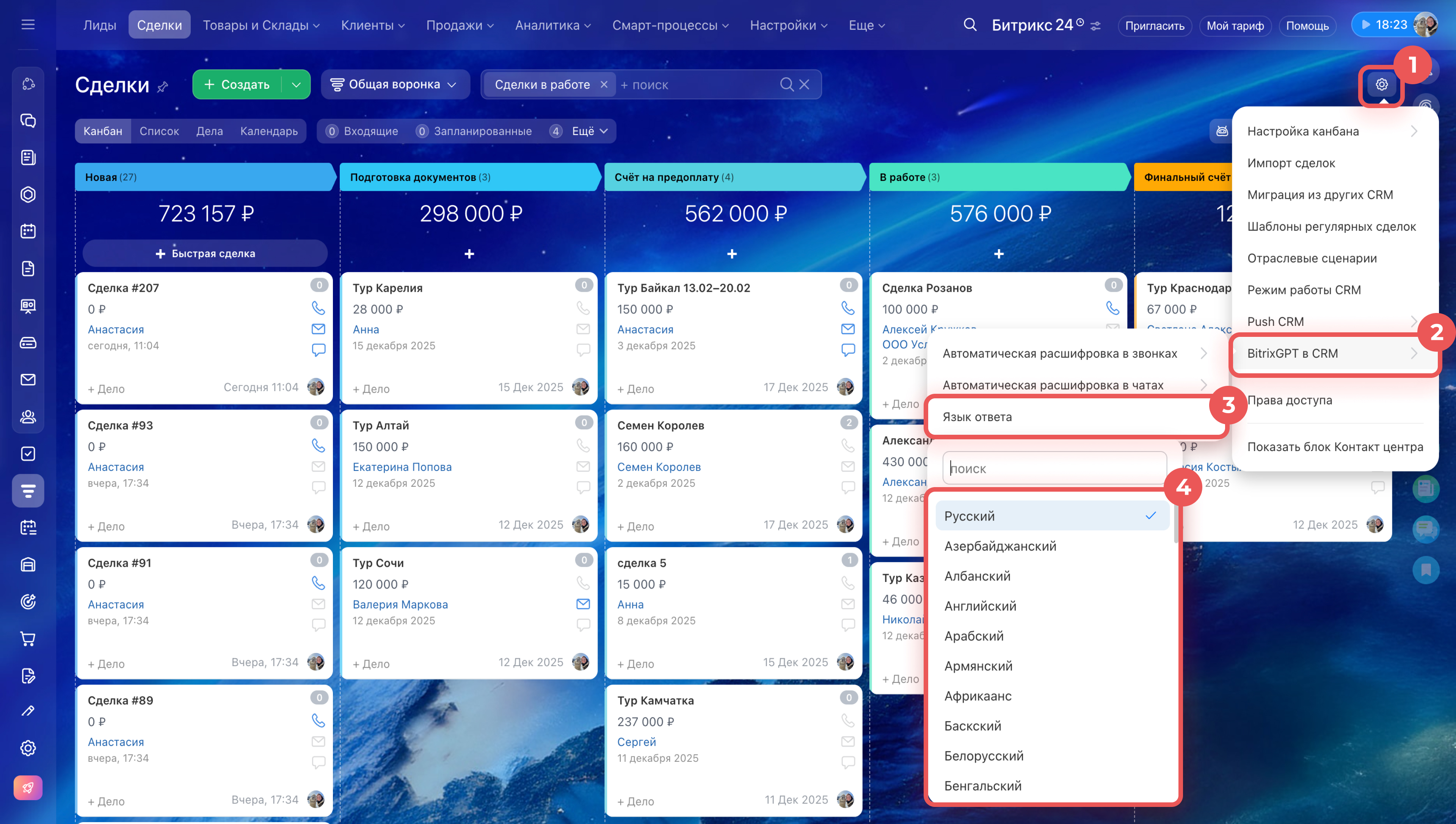 Откройте лиды или сделки и перейдите в Настройки (⚙️) > BitrixGPT в CRM > Язык ответа и выберите нужный вариант.