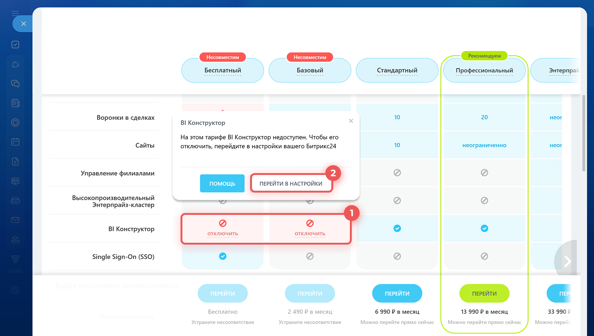 - Если переходите на тариф Базовый или Бесплатный, BI Конструктор надо отключить вручную. При отключении удаляются все настройки и пользовательские отчеты.
