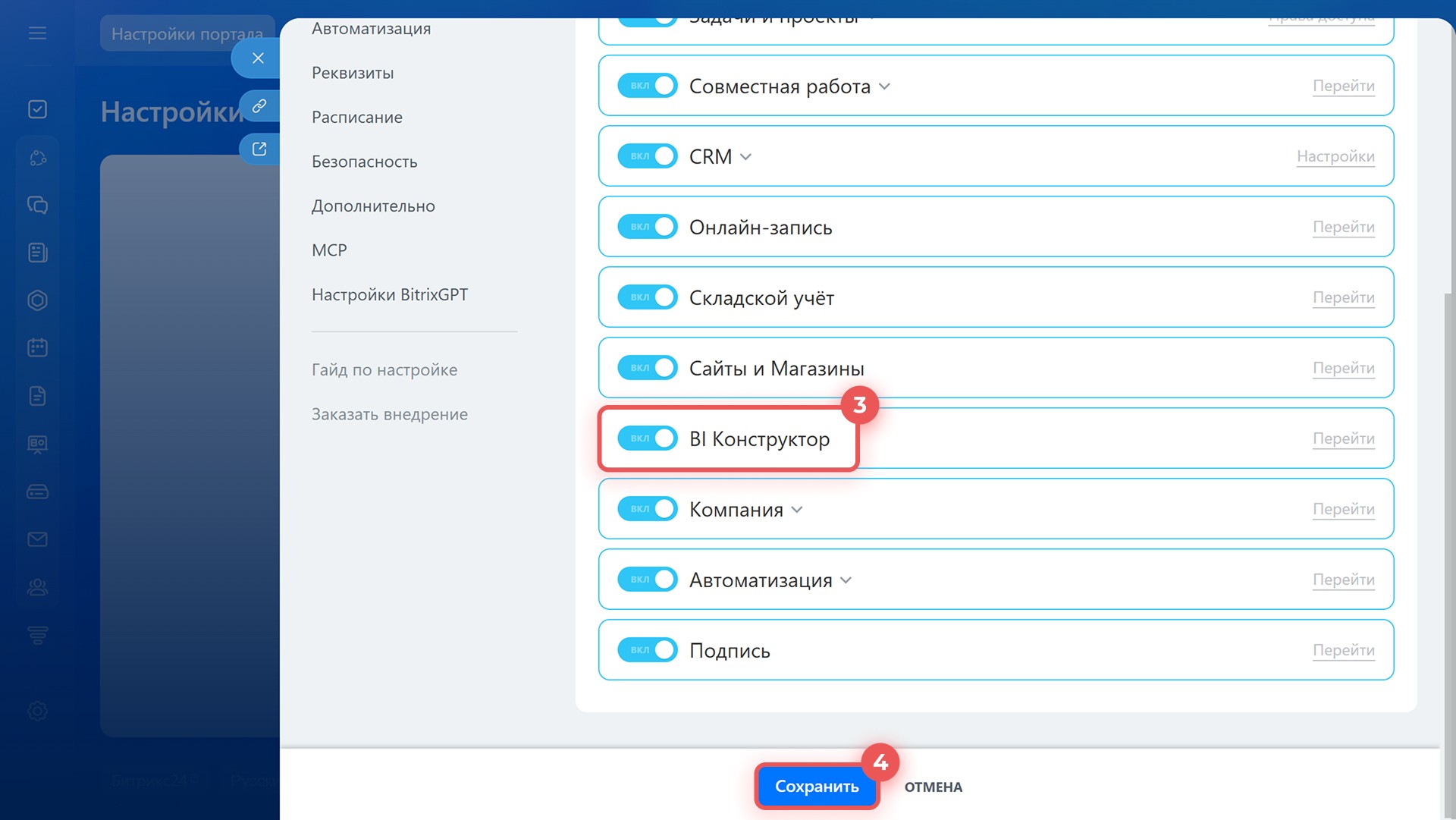 3–4. В настройках Битрикс24 отключите BI Конструктор и сохраните изменения.