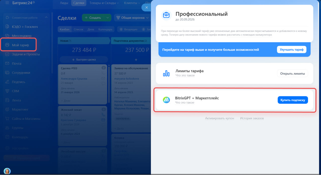 В левом меню Битрикс24 перейдите в Мой тариф. В разделе Подписка на Маркетплейс нажмите Оформить подписку.