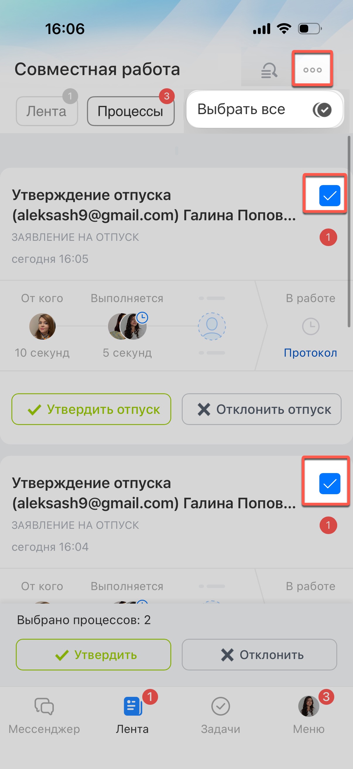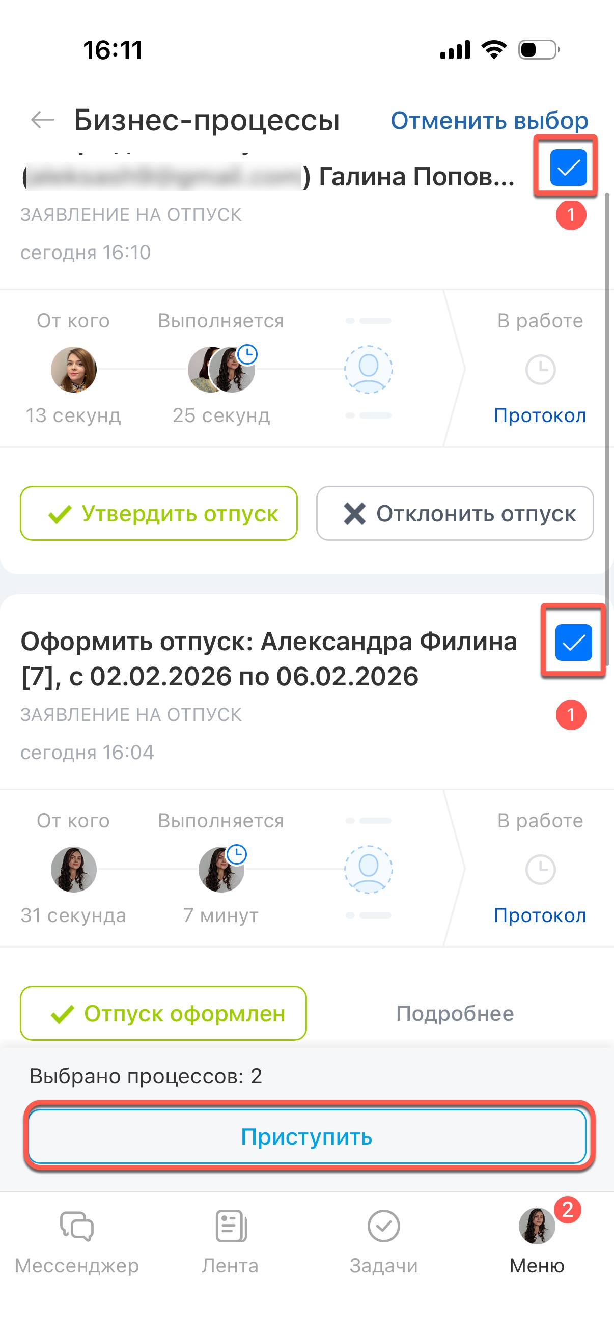 - Можно выполнить сразу все процессы с одним типом задания. Например, утвердить все заявления на отпуск или ознакомиться со всеми приказами.