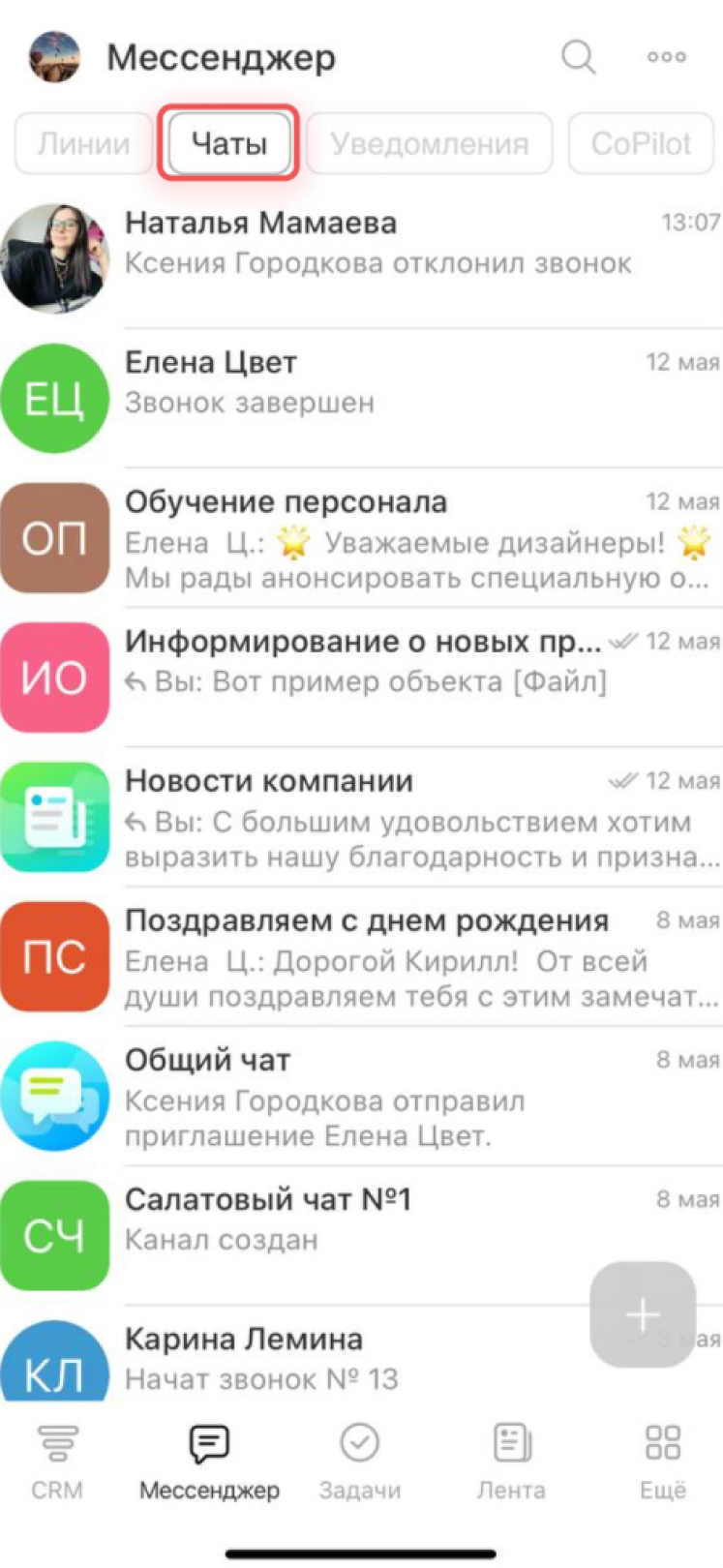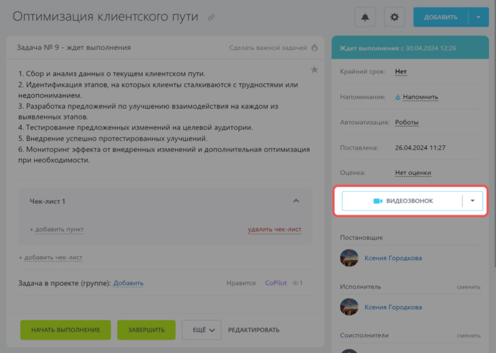 - Начать звонок можно из любой задачи, встречи или чата.