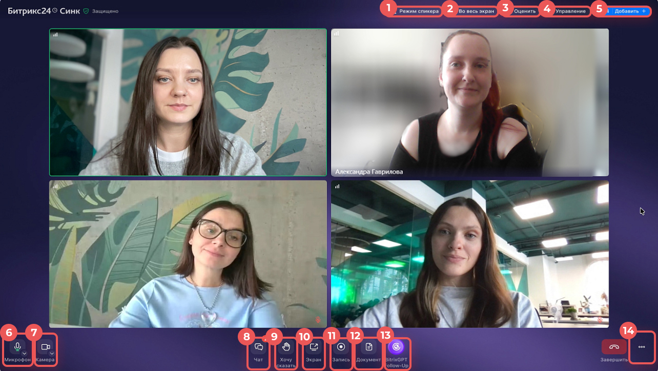 Запись звонка, изменение фона и выбор 3D-аватара доступны только в приложении Битрикс24.
