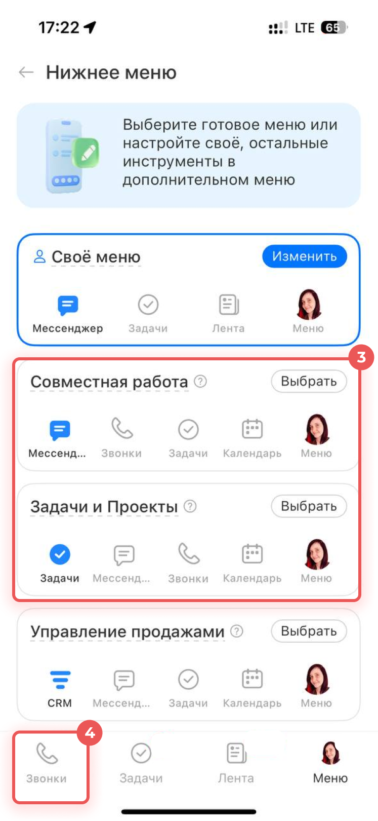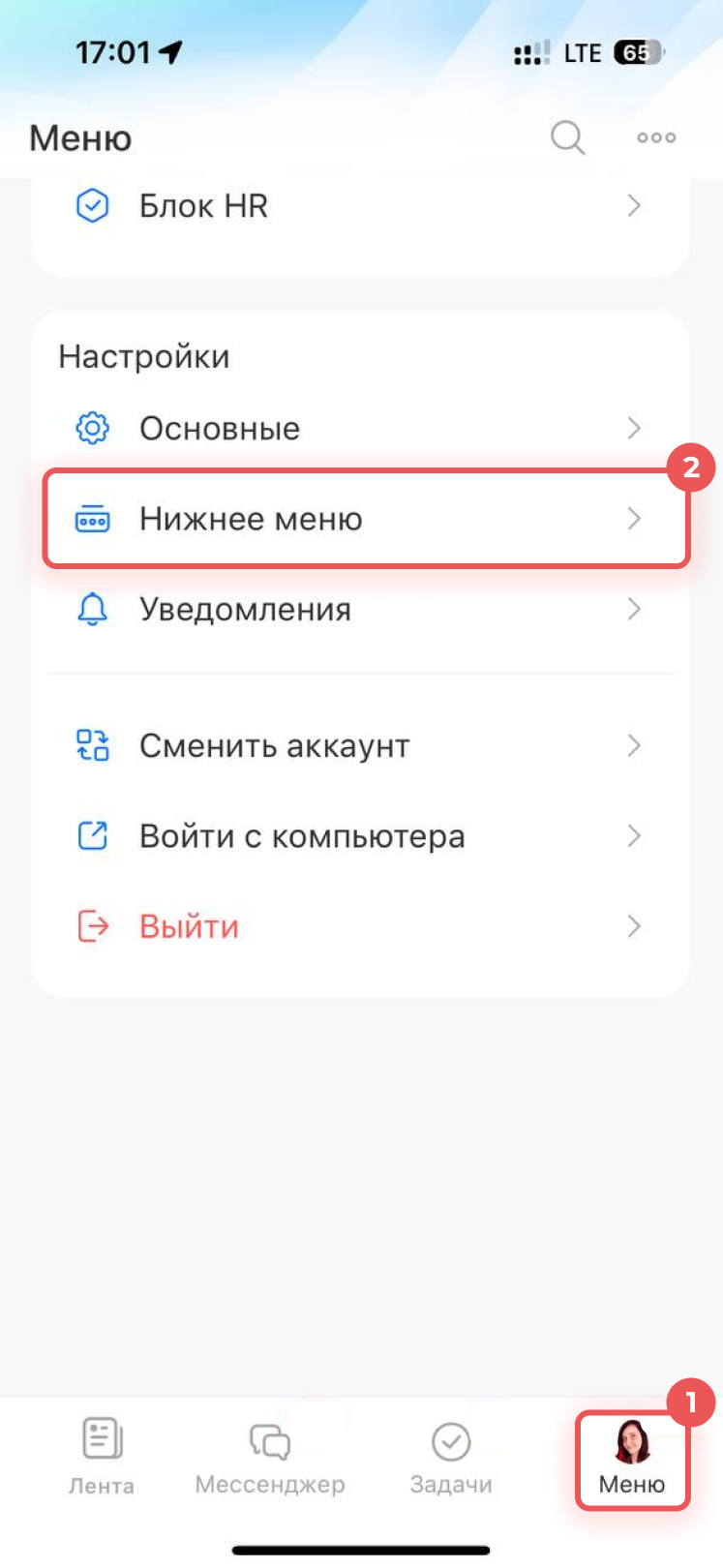 1–2. В мобильном приложении перейдите в Меню > Нижнее меню.