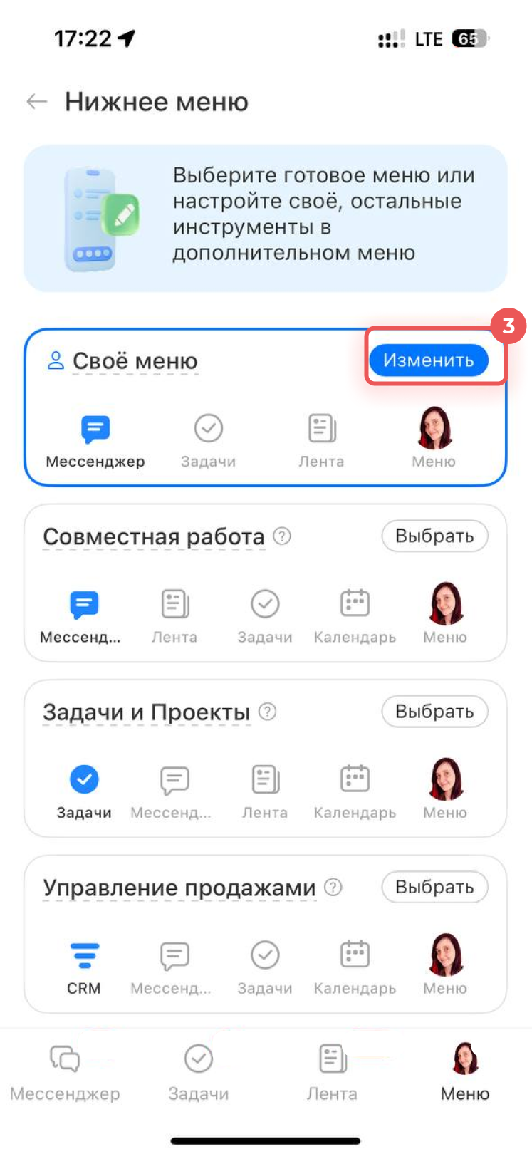 3. Выберите Свое меню и нажмите Изменить.