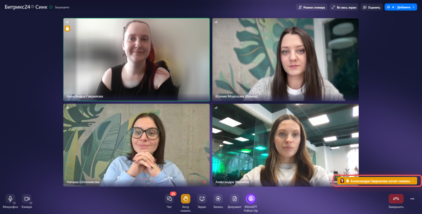 - Сказать — нажмите, если хотите что-то спросить или рассказать во время звонка. Спикер увидит поднятую руку и даст слово.