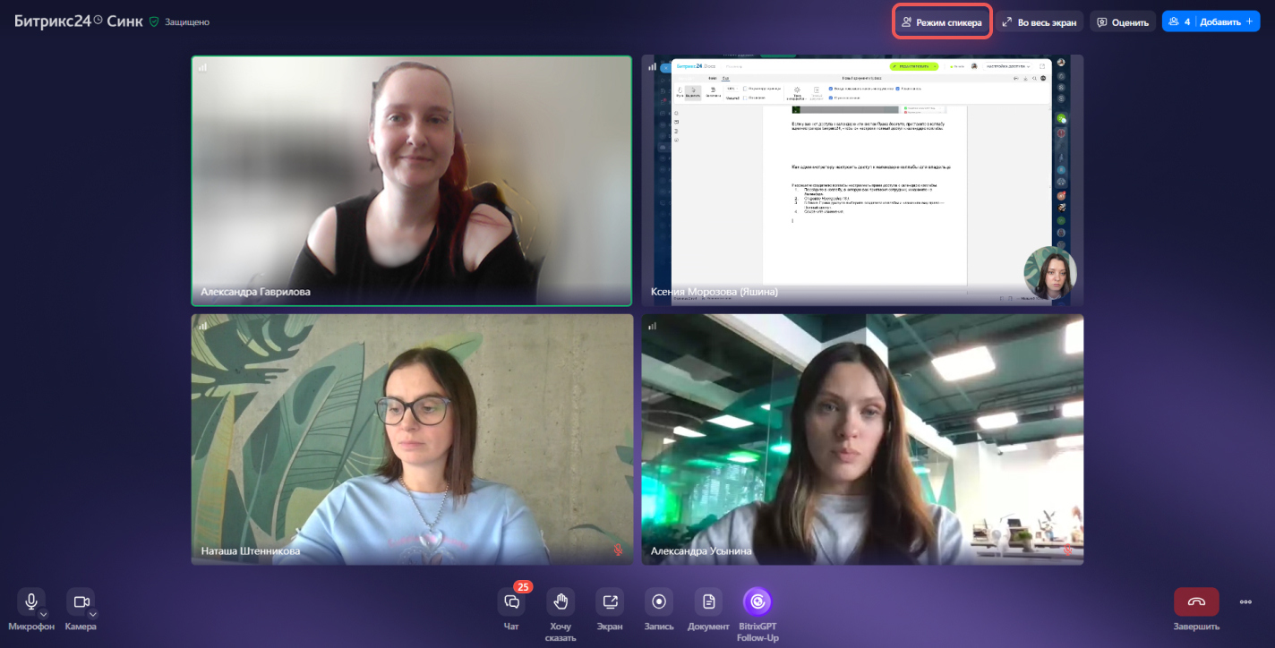 1. Поменять расположение окон с видео коллег — нажмите Режим спикера.