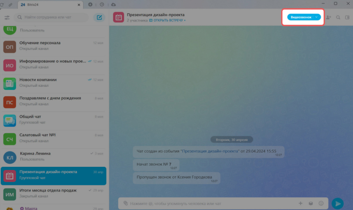Позвонить из чата. В Битрикс24 можно совершать видеозвонки один на один с коллегой и созваниваться всем отделом. Чтобы позвонить, нажмите Видеозвонок.