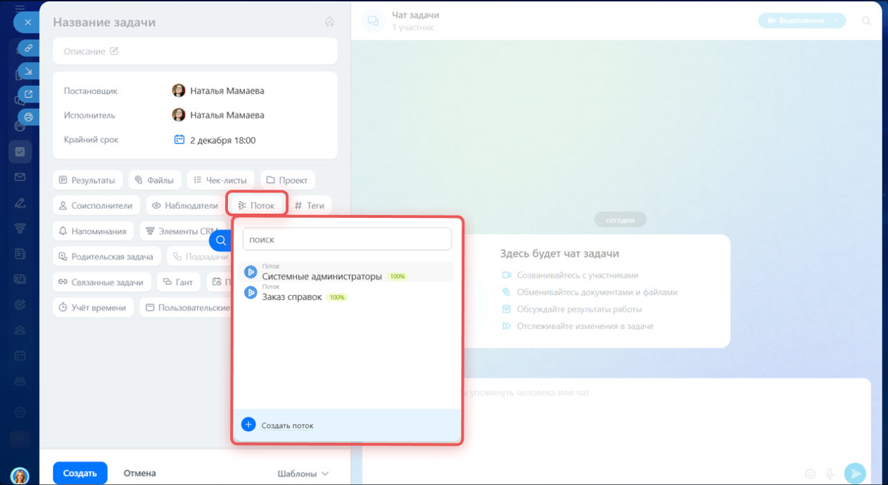 В списке Потоков. Перейдите в раздел Задачи и Проекты > Потоки. Выберите Поток и нажмите Создать задачу.