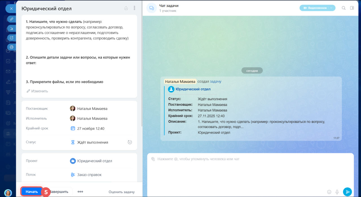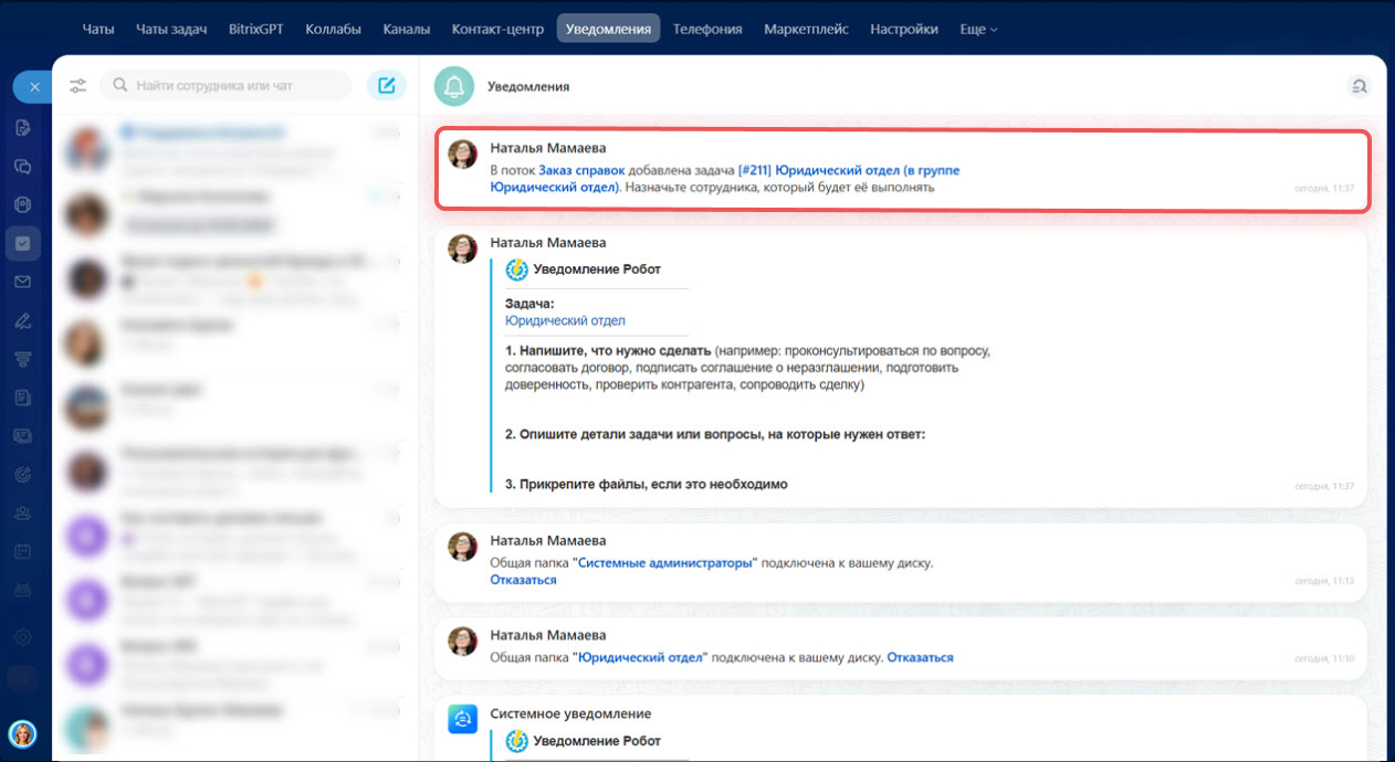 Если в потоке установлен тип распределения задач — Самостоятельно, команда потока получит уведомление о новой задаче, которую надо взять в работу.