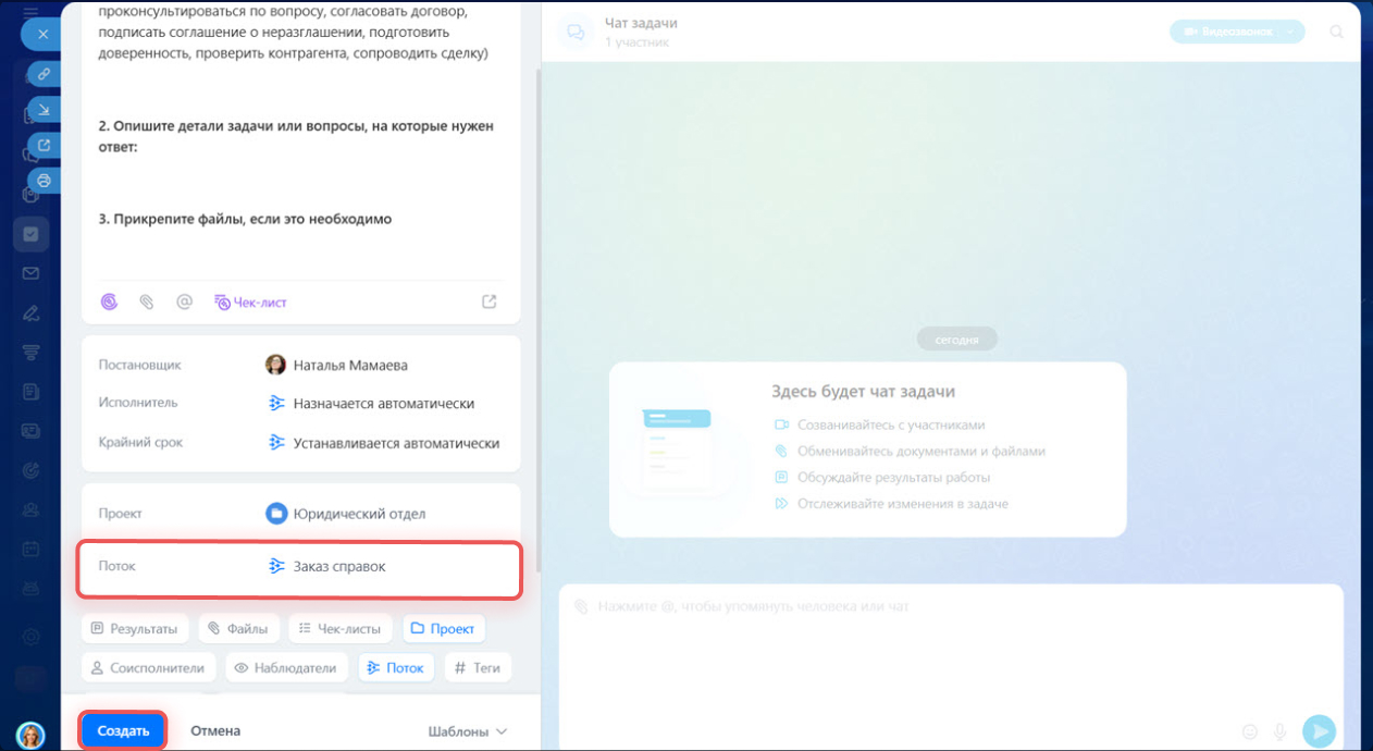 В Потоках можно создать задачу для конкретного отдела или процесса, например для обучения новых сотрудников. Задача попадет сотруднику, который должен её выполнить, даже если вы не знаете кого выбрать исполнителем.