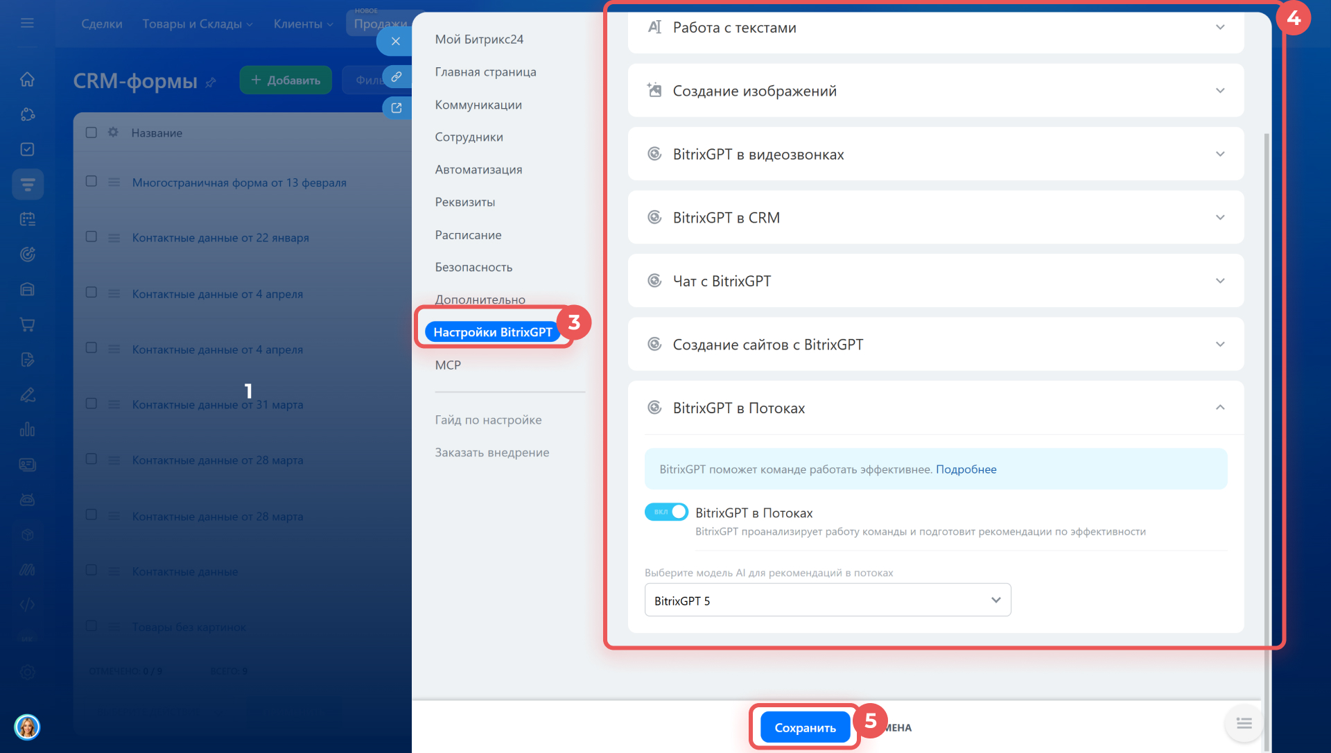 3–4. Выберите Настройки BitrixGPT и сдвиньте переключатель напротив нужных пунктов.