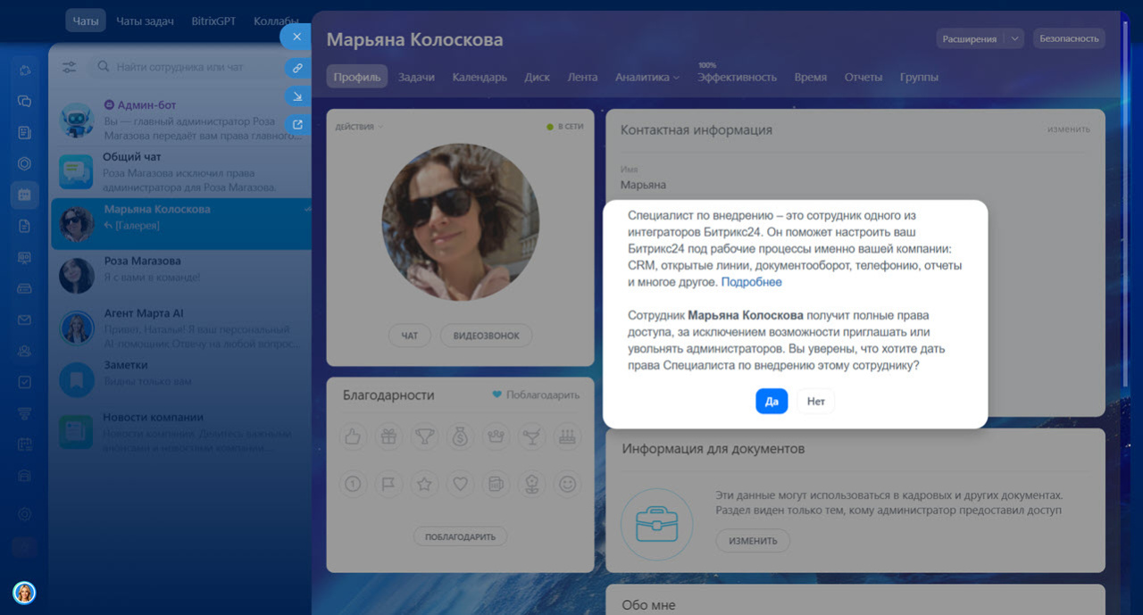 Специалист по внедрению — это сотрудник компании-интегратора, который помогает настраивать инструменты Битрикс24. Так называется и его роль в Битрикс24. У специалиста по внедрению есть такие же права, как у администратора, но с некоторыми ограничениями.