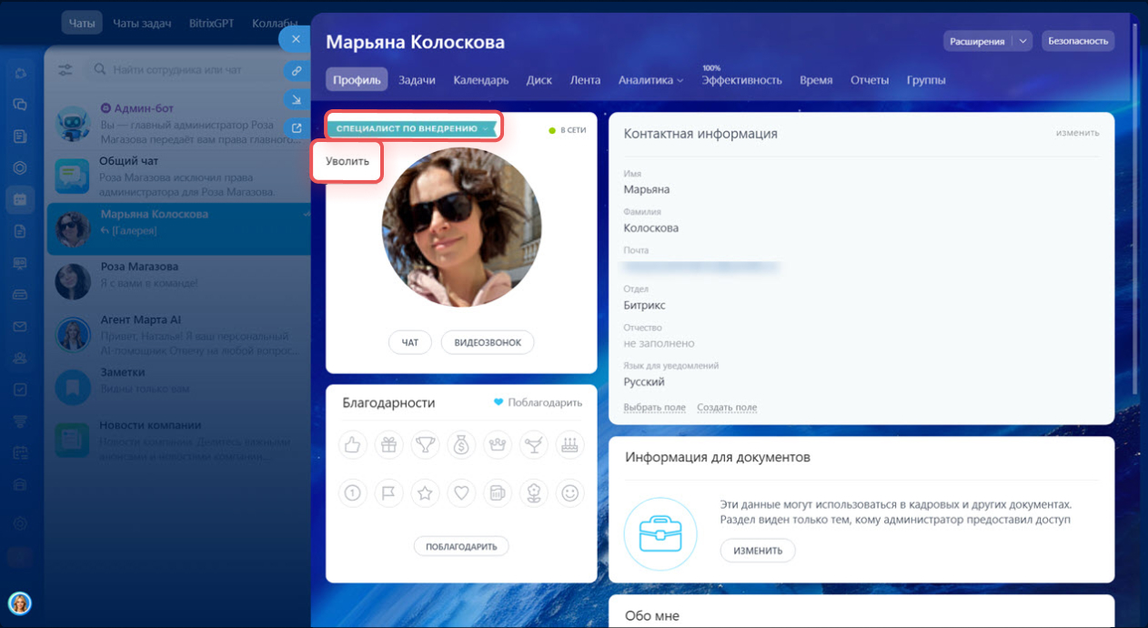 После настройки Битрикс24 вы можете уволить специалиста по внедрению. Перейдите в его профиль, нажмите Специалист по внедрению> Уволить.