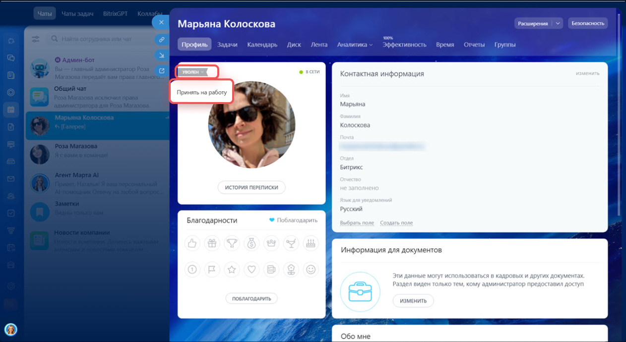 Если вам снова понадобятся услуги специалиста по внедрению, можно принять на работу уволенного сотрудника. В профиле нажмите Уволен > Принять на работу.