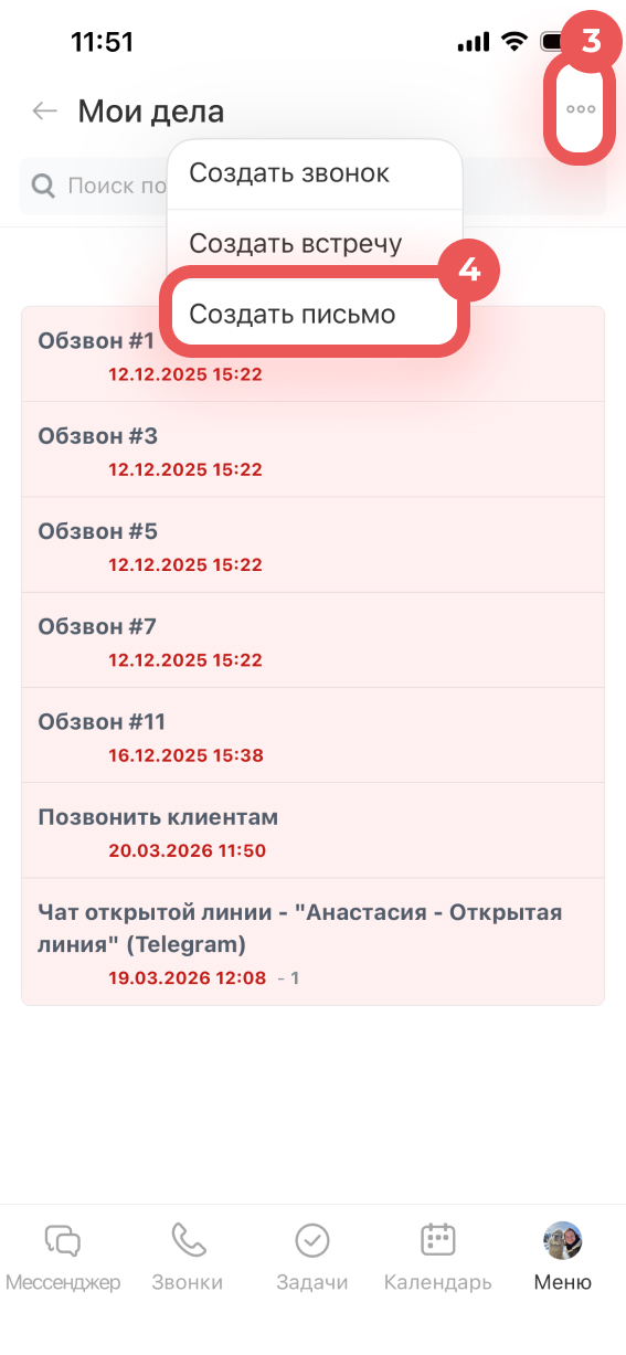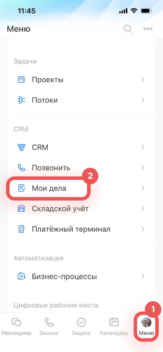 - Чтобы посмотреть запланированные дела или создать новые, перейдите в CRM > Еще > Мои дела.