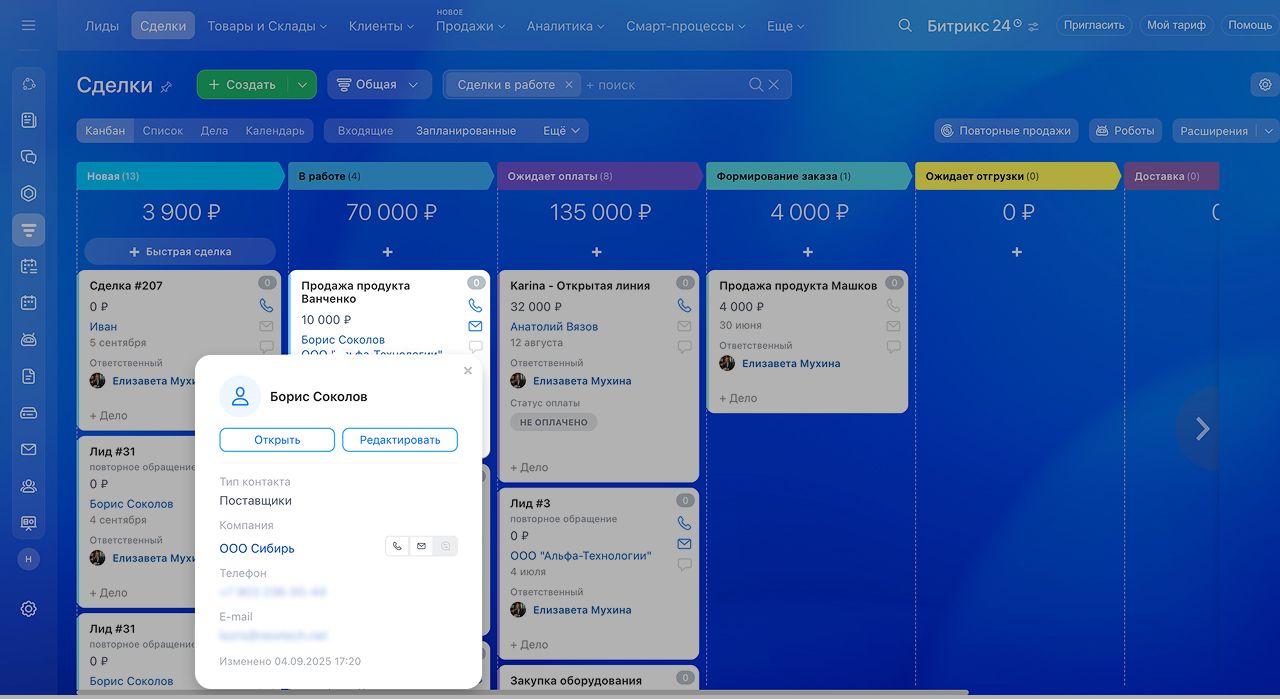 Перейдите в раздел CRM, выберите нужный элемент и откройте Канбан.