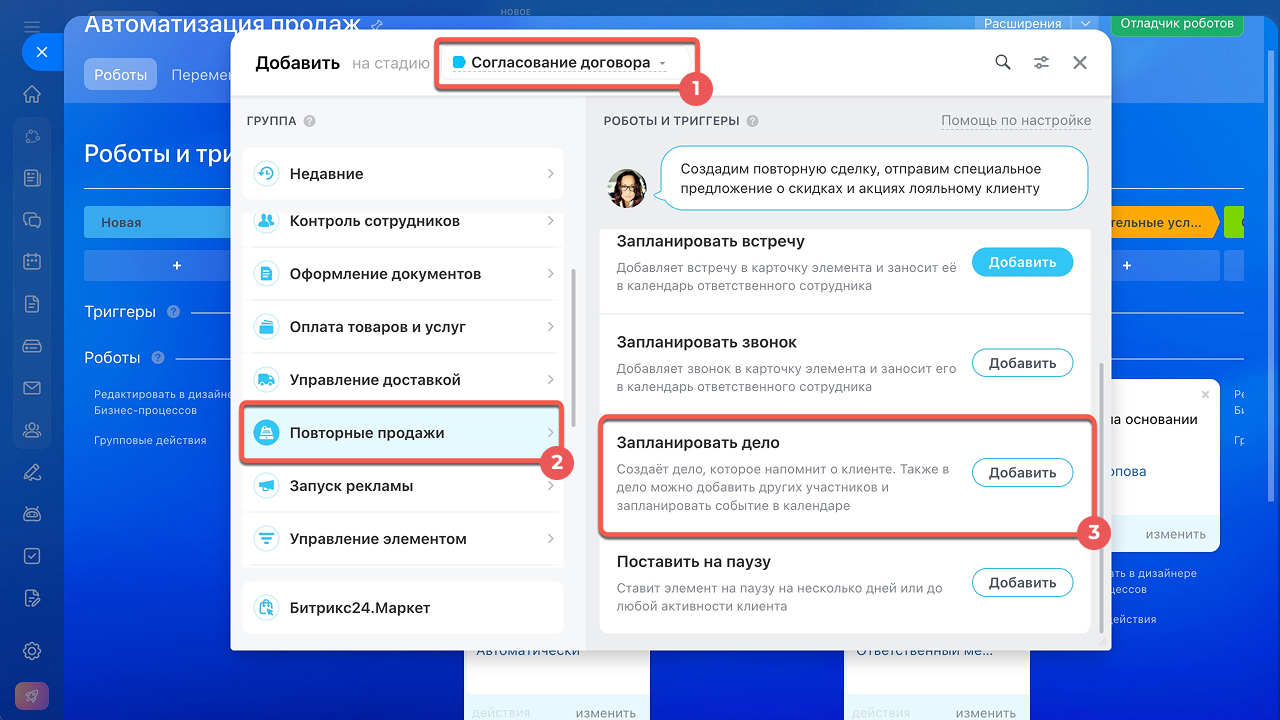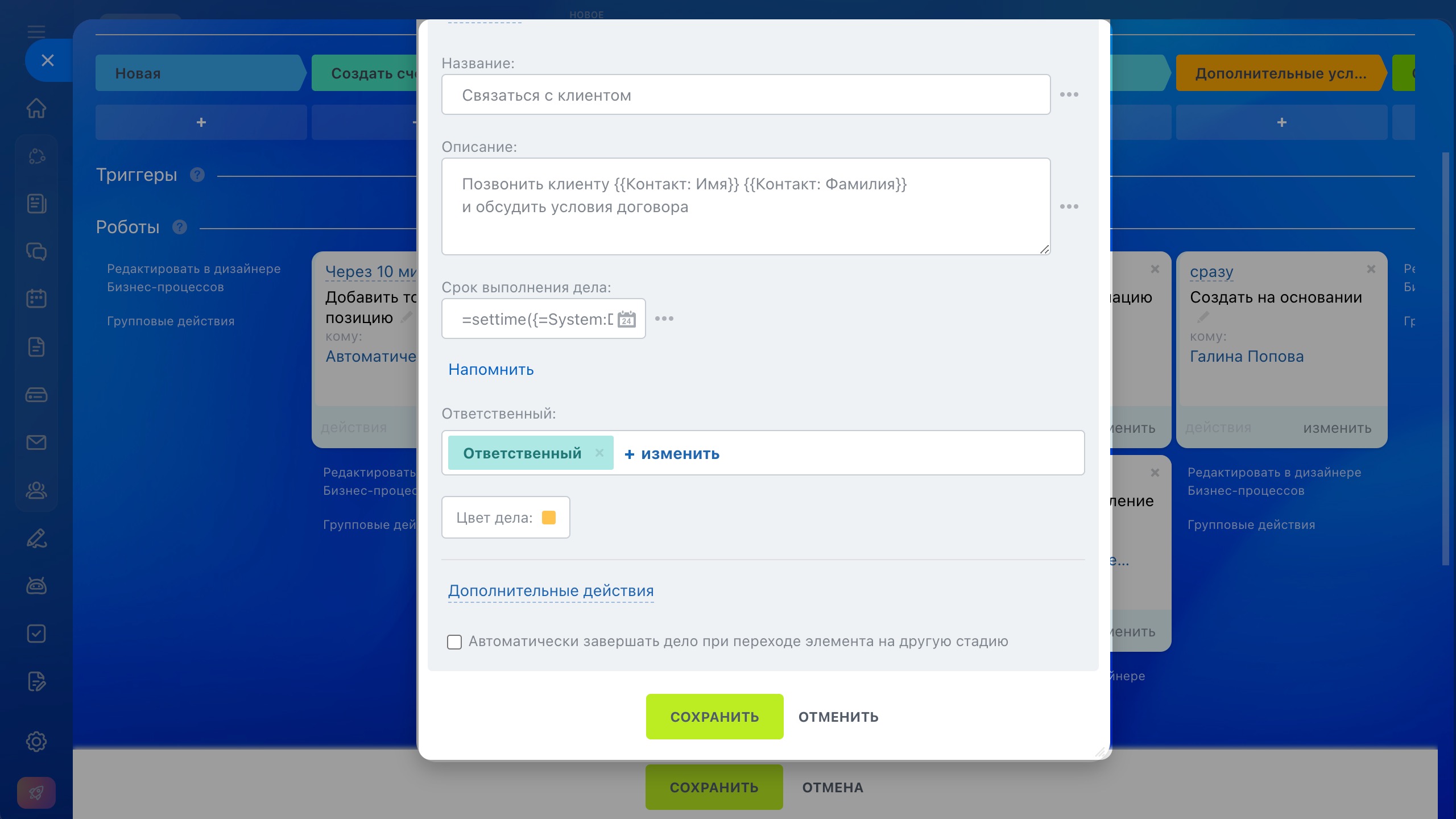 Когда элемент CRM попадает на определенную стадию, робот планирует дело: встречу, звонок, подготовку документов. Это помогает менеджеру не забыть связаться с клиентом.