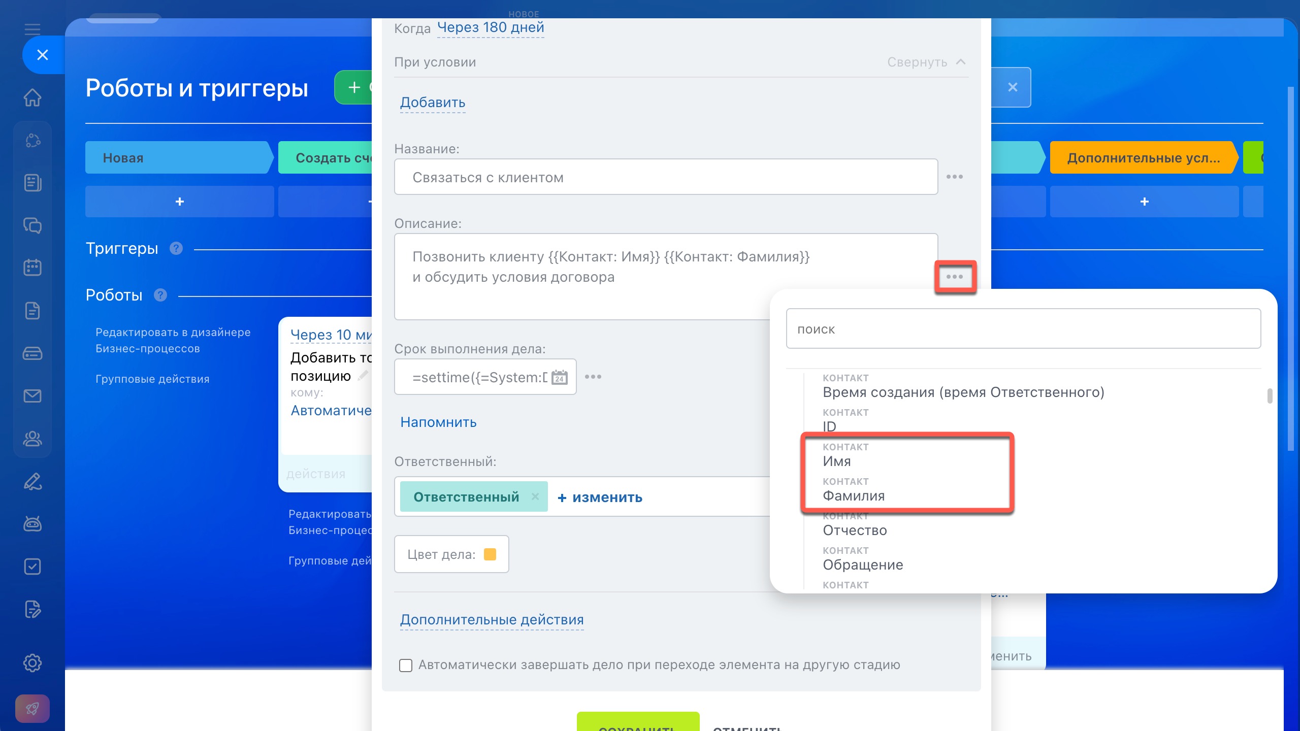 Описание. Напишите, что надо сделать менеджеру. Можно добавить информацию из полей сделки: имя, адрес клиента, важные комментарии. Для этого нажмите на Три точки (...) и выберите нужное поле.