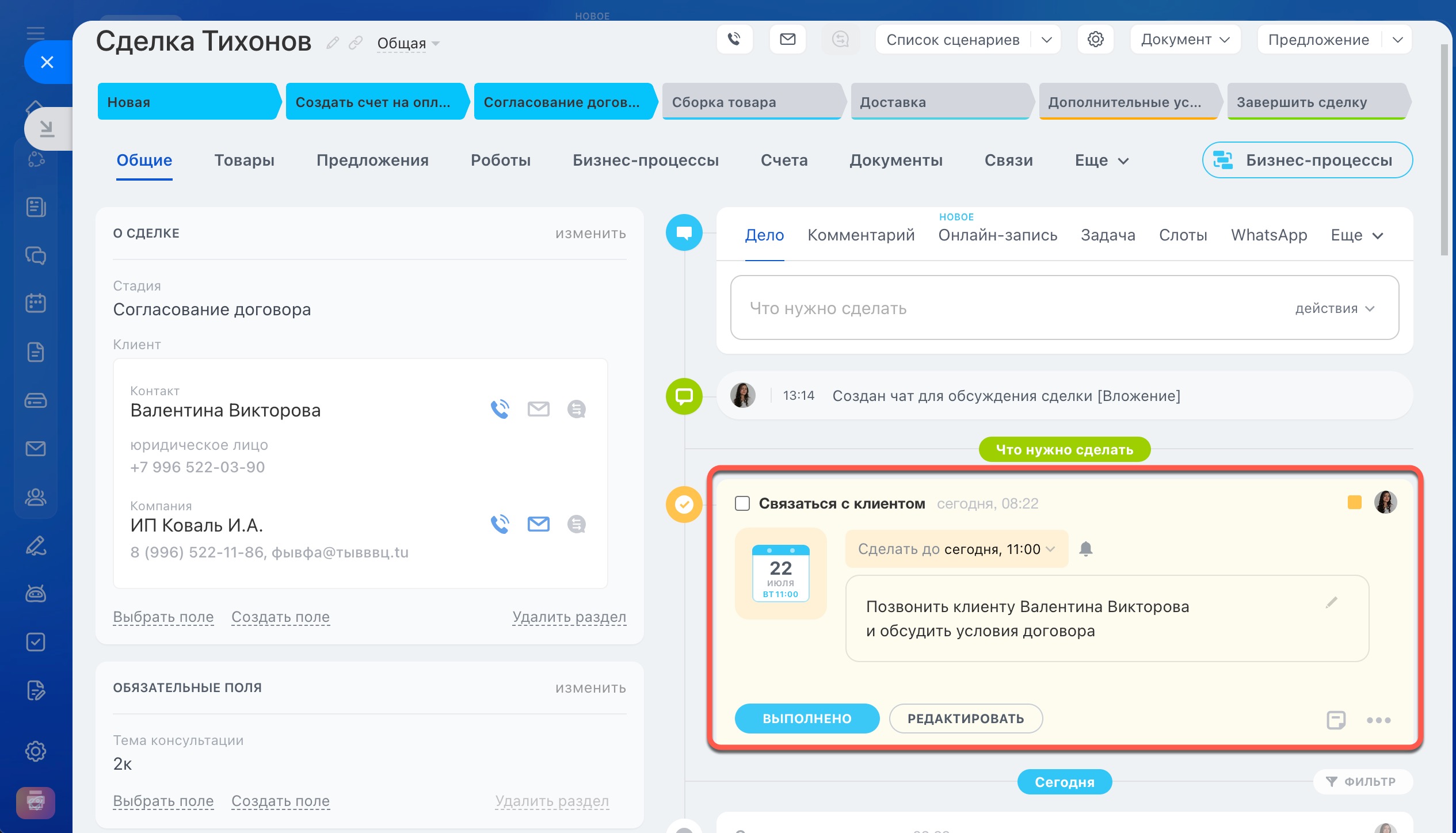 Проверим, как сработал робот. Когда сделка перешла на стадию «Согласование договора», робот запланировал дело для менеджера. Дело отображается в карточке CRM и календаре сотрудника.