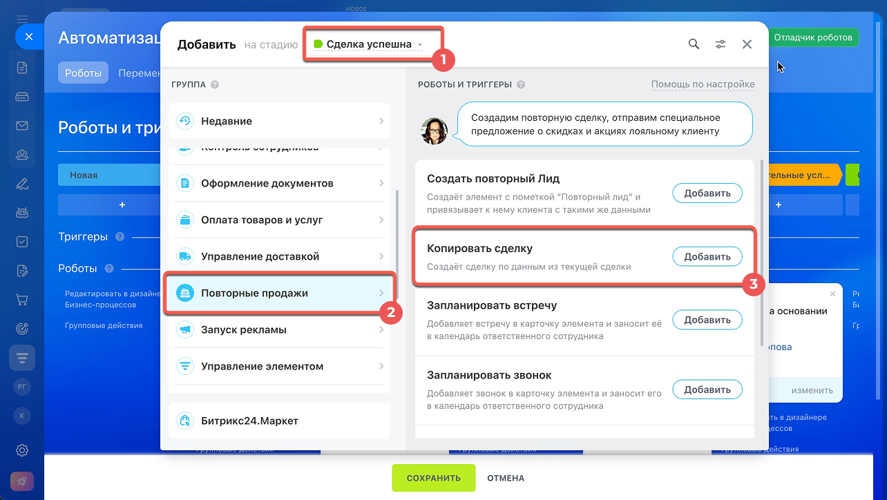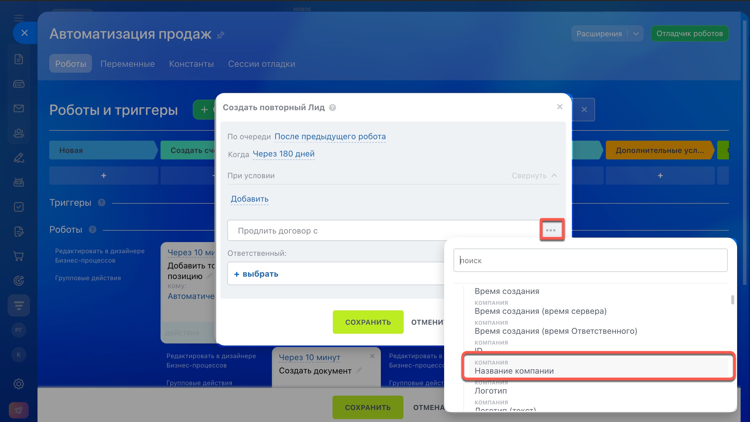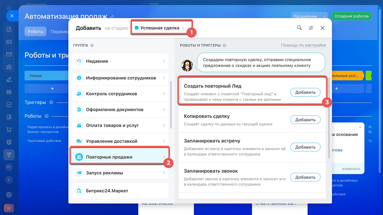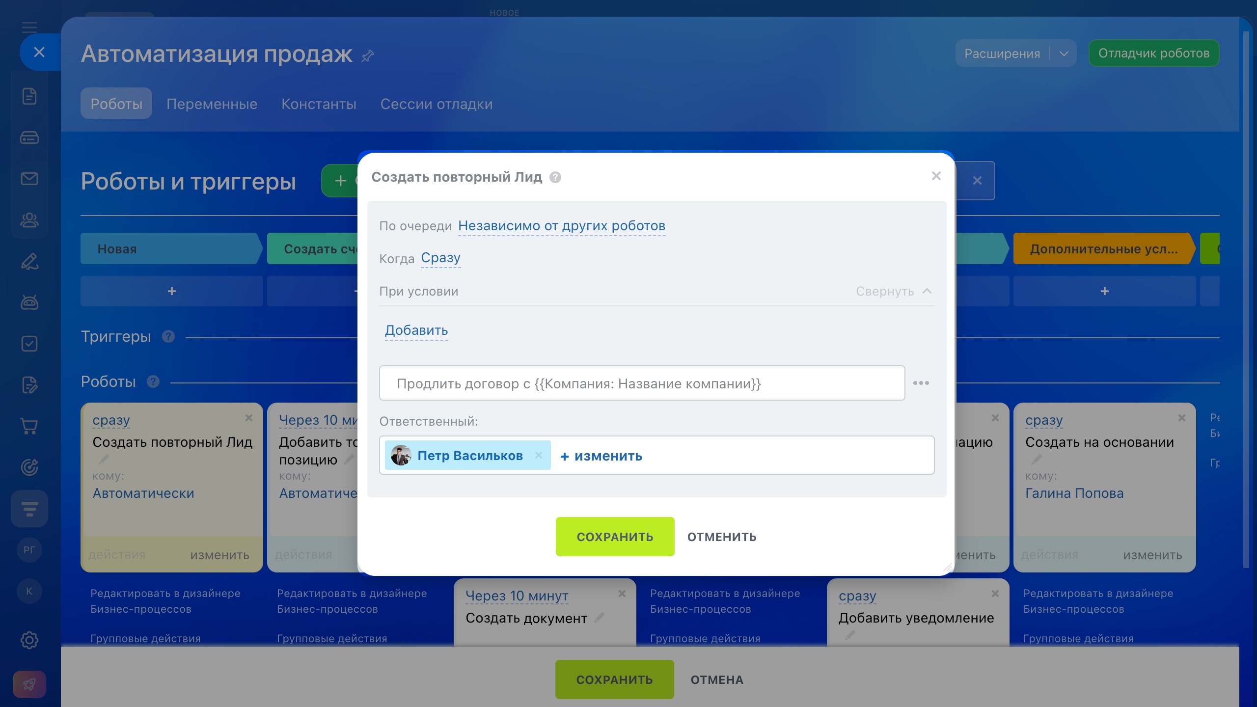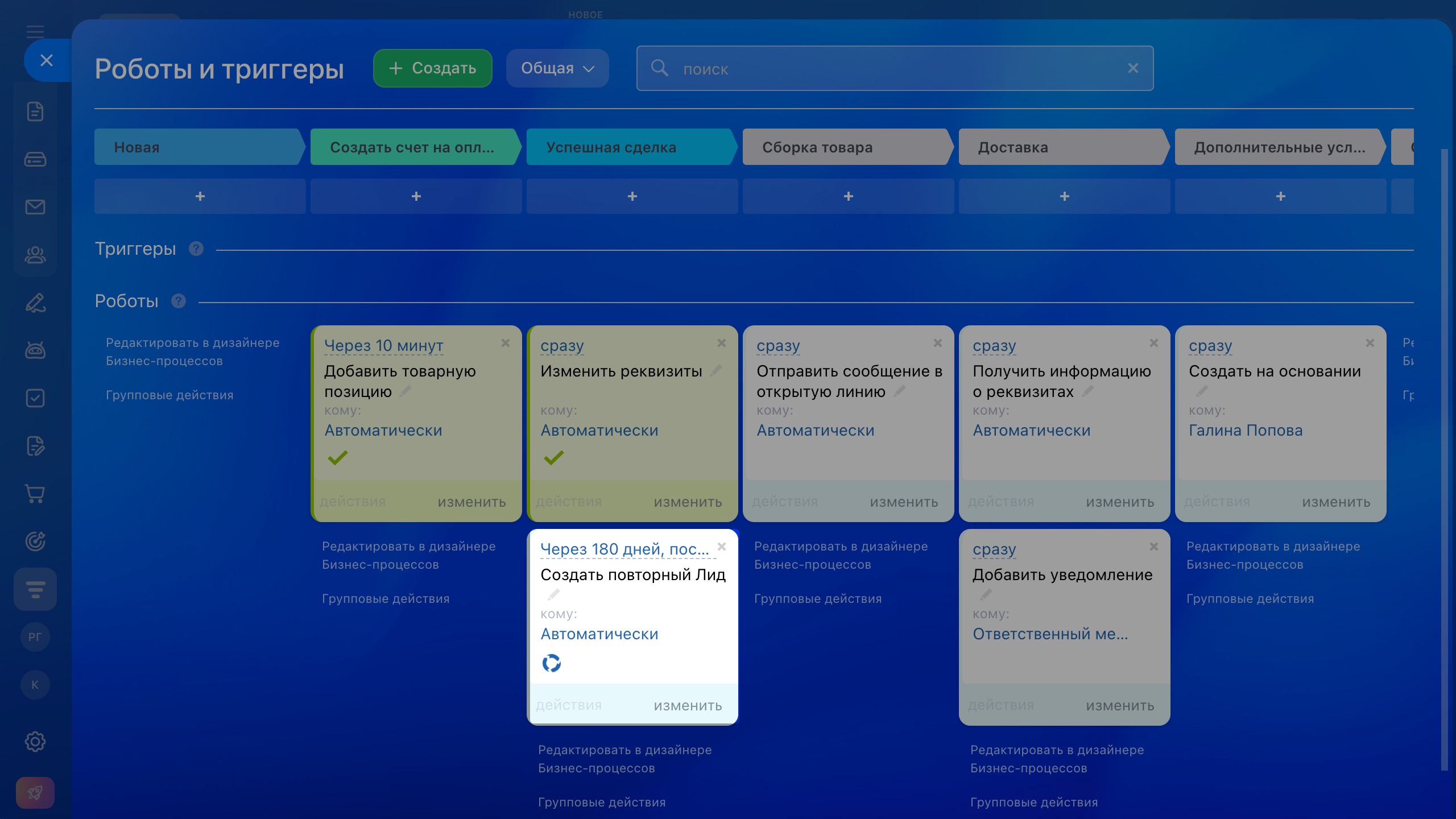Когда сделка попадает на определенную стадию, робот создает повторный лид. Например, после завершения сделки можно предложить клиенту дополнительные услуги или напомнить о завершении договора обслуживания.